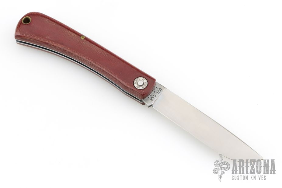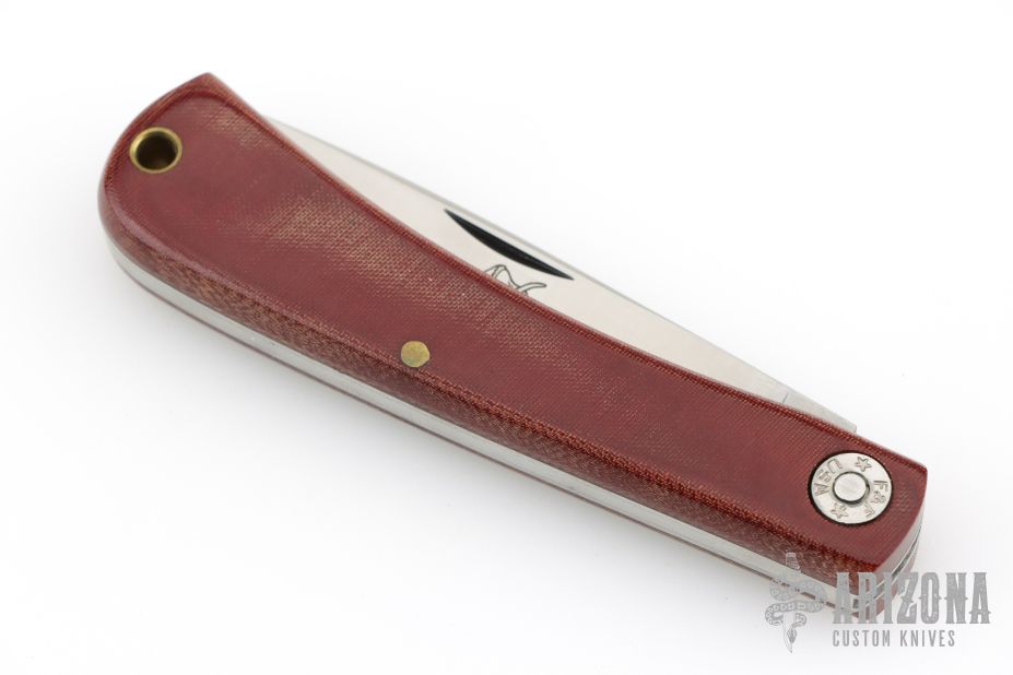 This Farm and Field Tool Bullnose by Great Eastern Cutlery features a satin finished drop point blade with swedge and nail nick. The handle has red linen micarta covers with brass pin and lanyard tube over stainless steel liners and backspring. Excellent condition. Includes original cardboard tube.