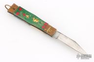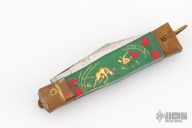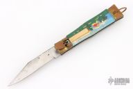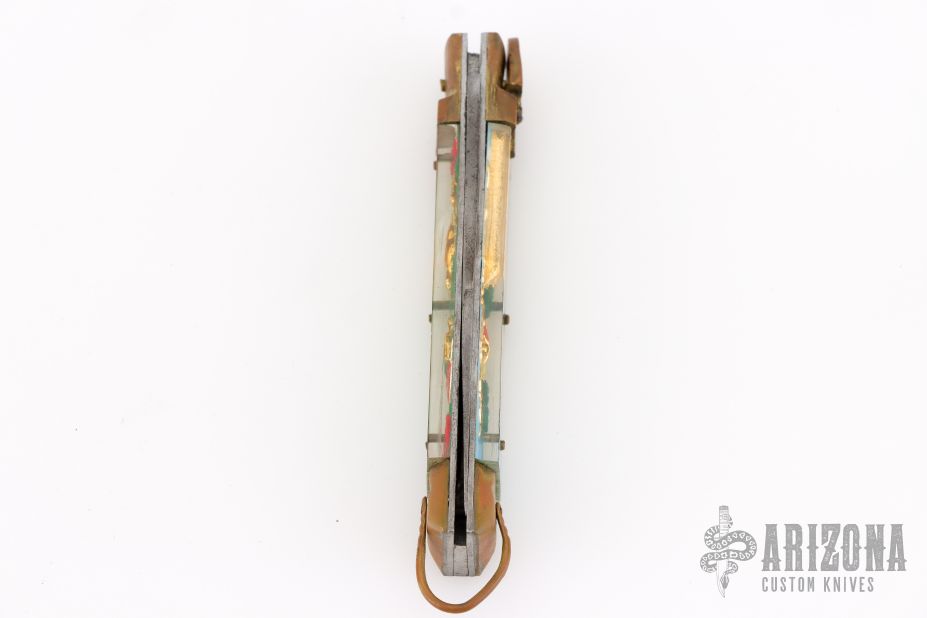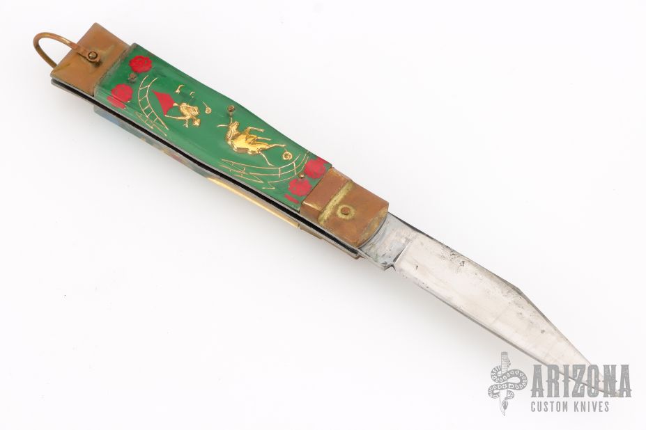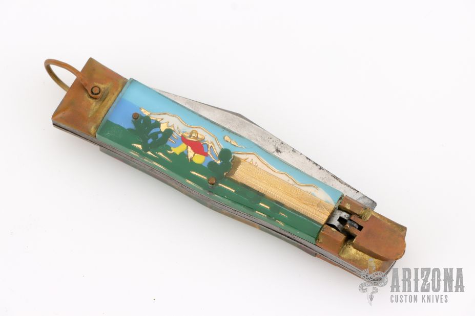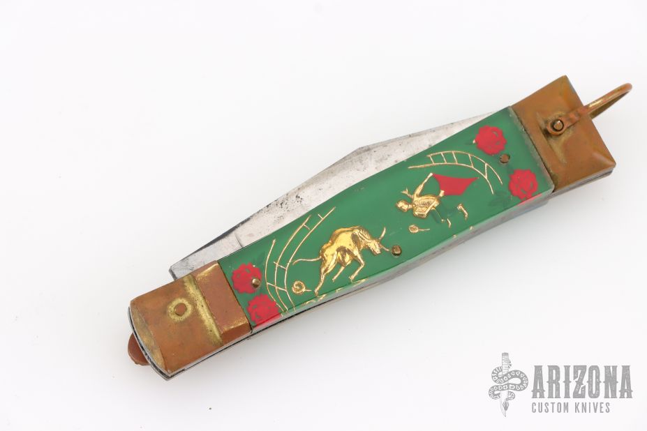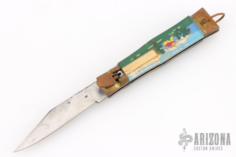 This Vintage leverlock auto features a polish finished blade, brass bolsters, acrylic scales, and steel liners and spring. Opens with a nice snap. Brass lever, and bail. Has scuffs, scratches, and patina. Great overall condition for its age, good condition otherwise.