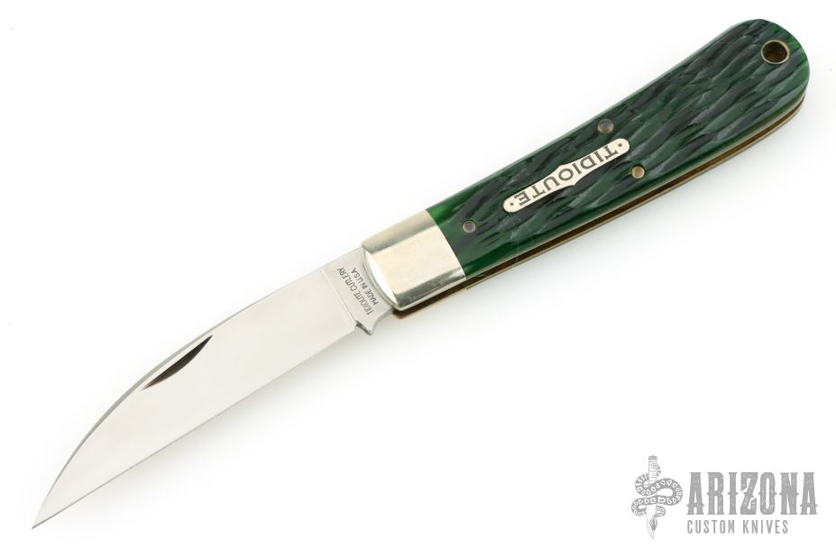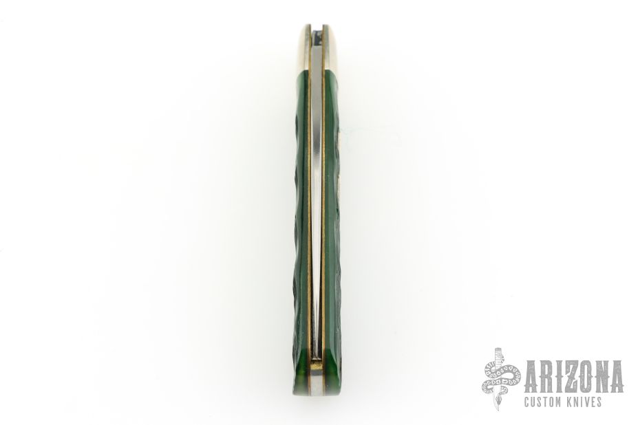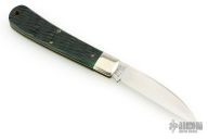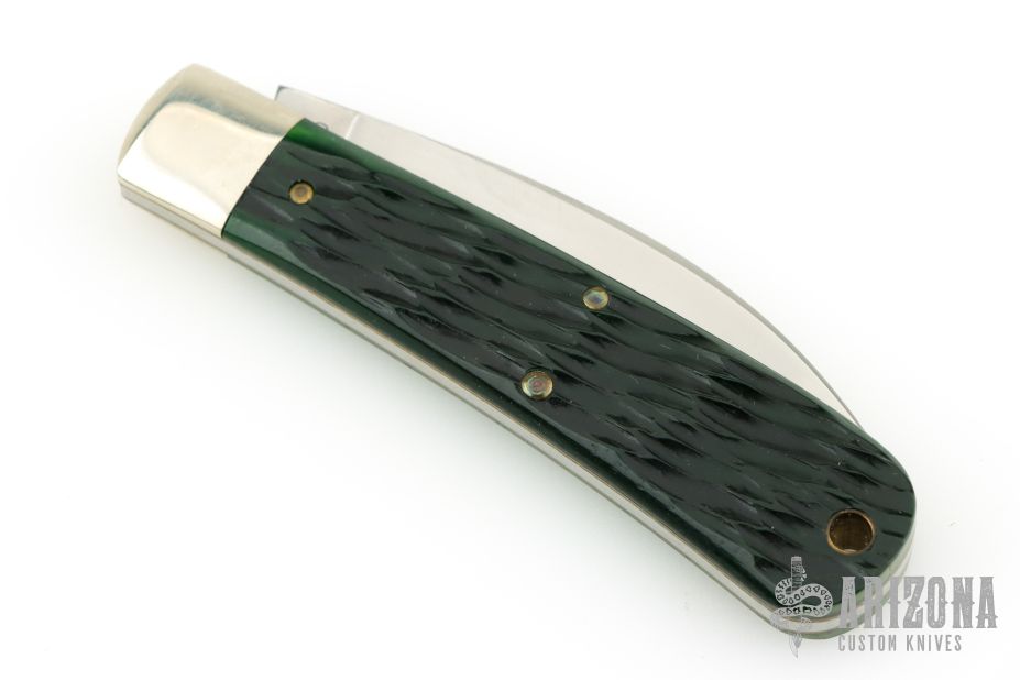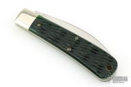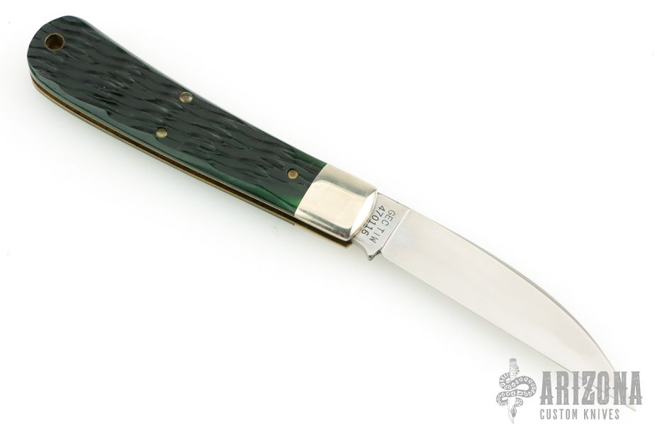 This Viper from Great Eastern Cutlery features a satin finished wharncliffe style blade with swedge and nail nick. The handle has pinched nickel silver bolsters and escutcheon and green bottle glass jigged bone covers over brass liners and steel backspring. Has Half-stop. Includes the original packaging. Excellent Condition.