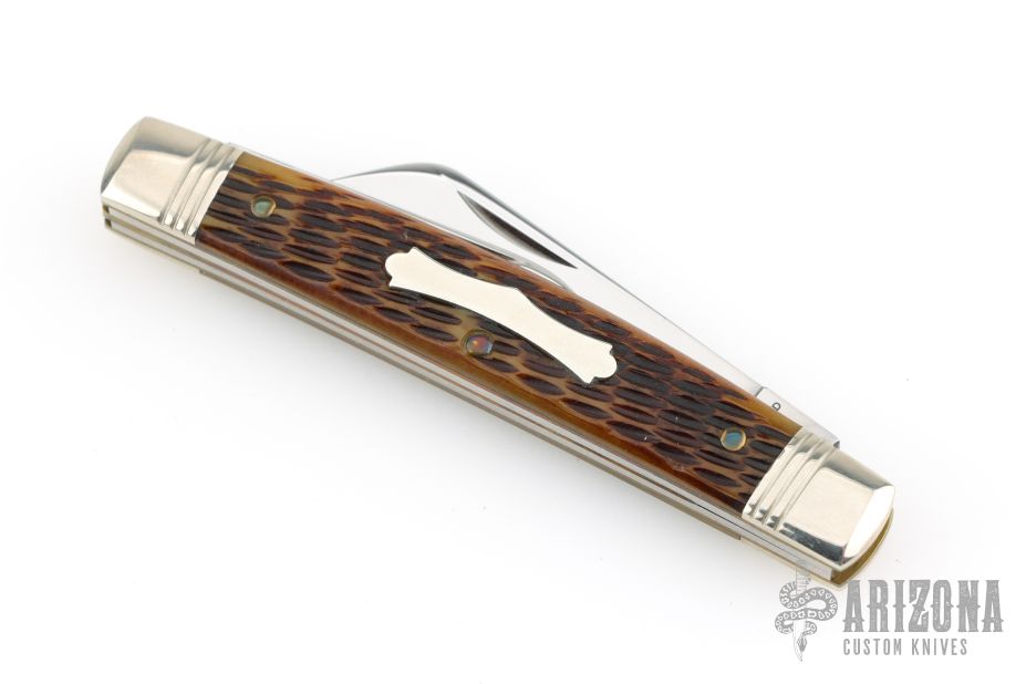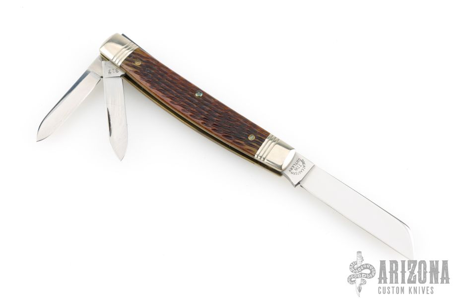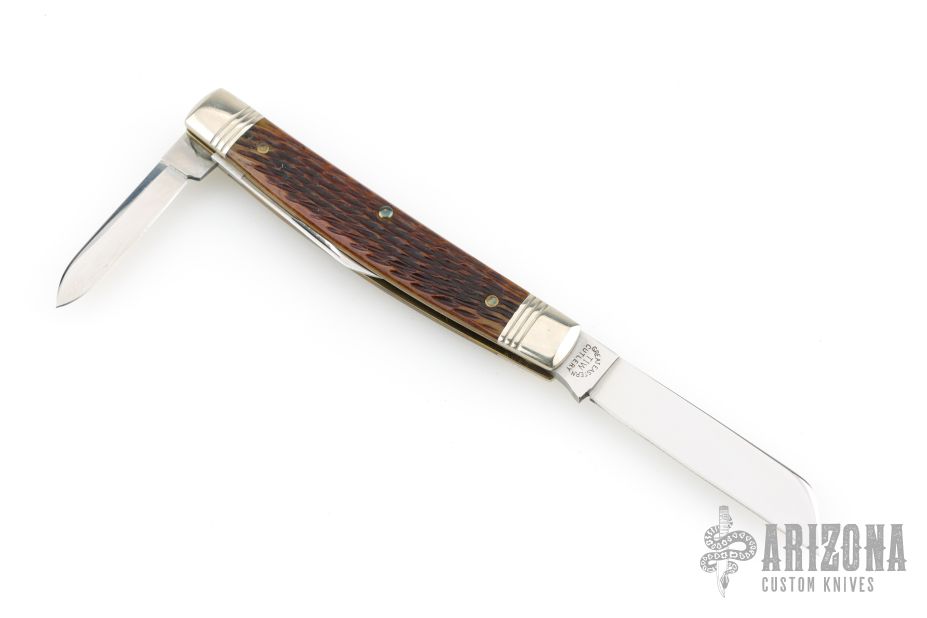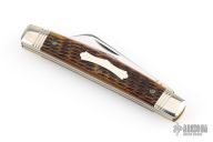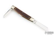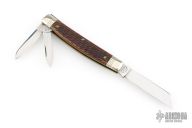 This Stockyard Whittler from Great Eastern Cutlery features three mirror finish blades. One large clip point, one sheepsfoot and one small awl blade all with nail nicks. The handle is comprised of nickel silver front/rear bolsters and deep chestnut jigged bone covers with nickel silver escutcheon over brass liners and steel springs. Includes original tube. Excellent condition.
