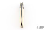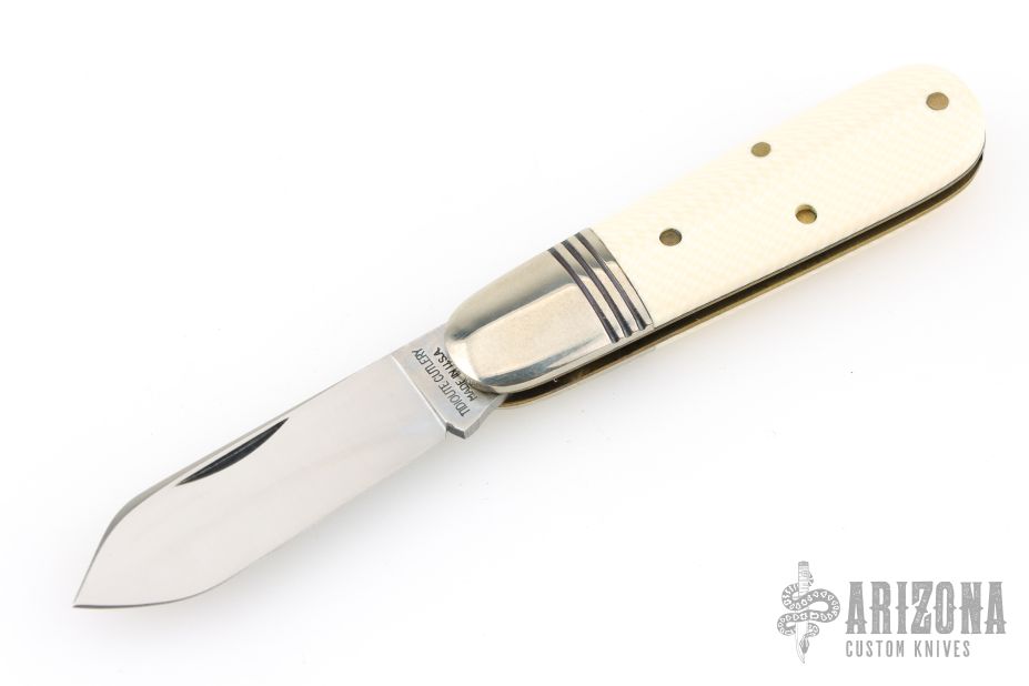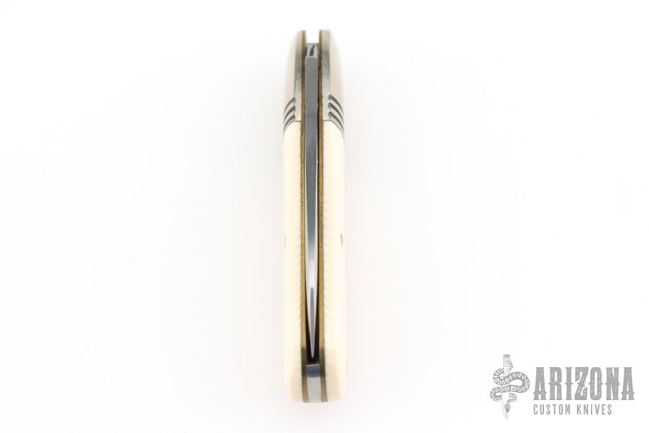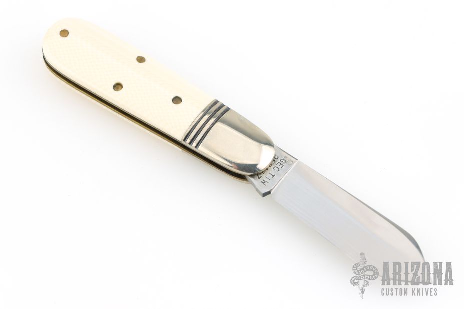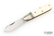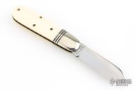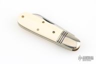 This Little Jack slipjoint by Great Eastern Cutlery features a satin finished blade with nail nick. The handle has nickel silver bolsters, unicorn ivory acrylic covers, brass liners and a steel spring. Has half-stop. Includes original tube. Excellent condition. 198 were made. This one is a Factory Second notified by the "S" on the blade and the tube.