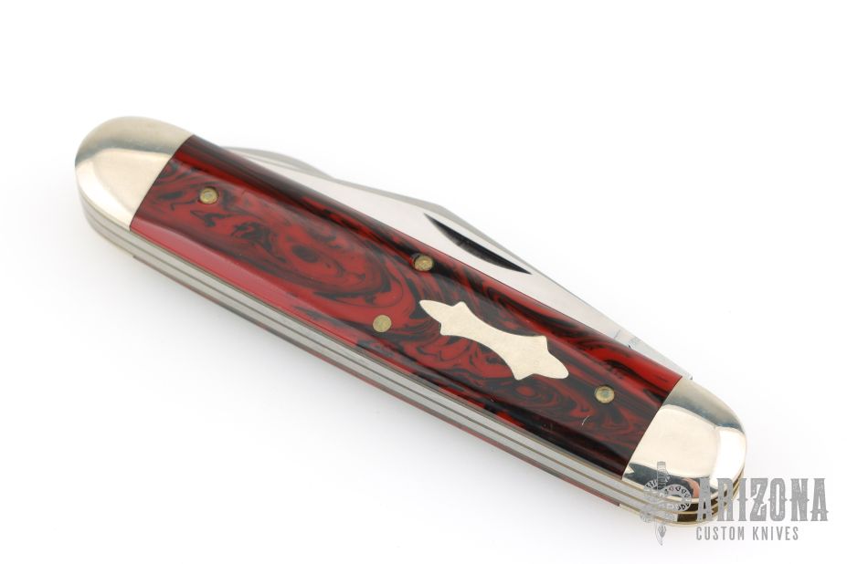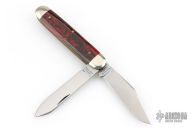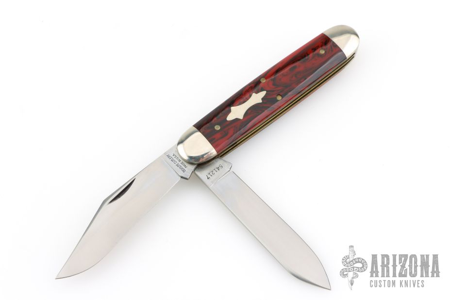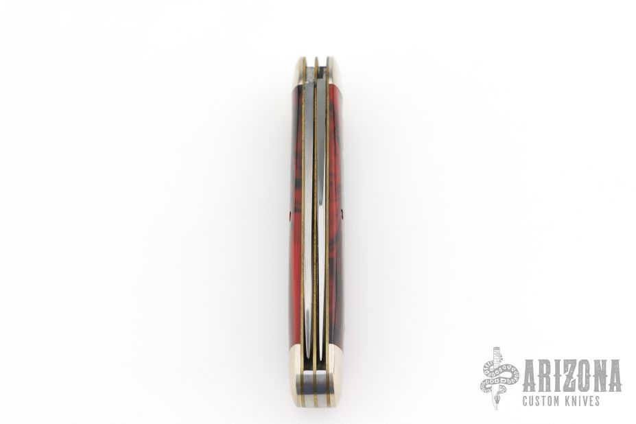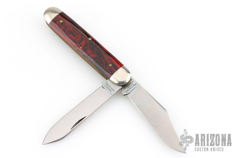 This slipjoint from Great Eastern Cutlery features two satin finished blades with nail nicks. The handle has nickel silver bolsters, Red River Acrylic covers with brass liners, and steel springs. Has half-stops. Includes original tube. Excellent condition.