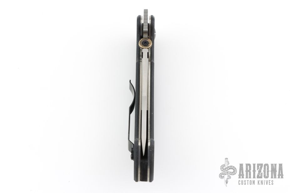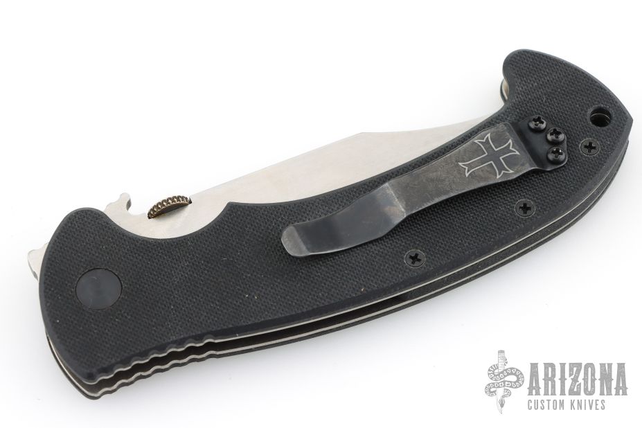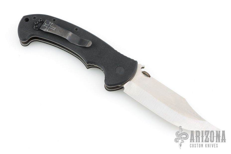 The CQC-13 is the first Bowie style folder from Emerson. Includes the patented Wave feature. Satin finished clip point blade with thumb disc. The handle has black G-10 scales, titanium liners, black G-10 backspacer and tip up black stainless clip. Comes in original box with paperwork. Marked "For ExquisiteKnives.com". Excellent condition.