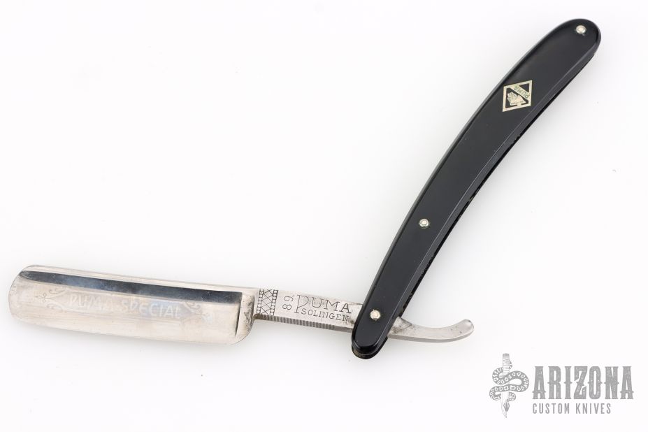 This Straight Razor by Puma features a full hollow ground, polish finished blade with a black handle. Has scuffs, scratches, and patina. Good overall condition. Has a crack on the rear scale at the pin.