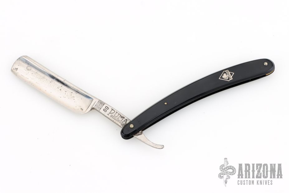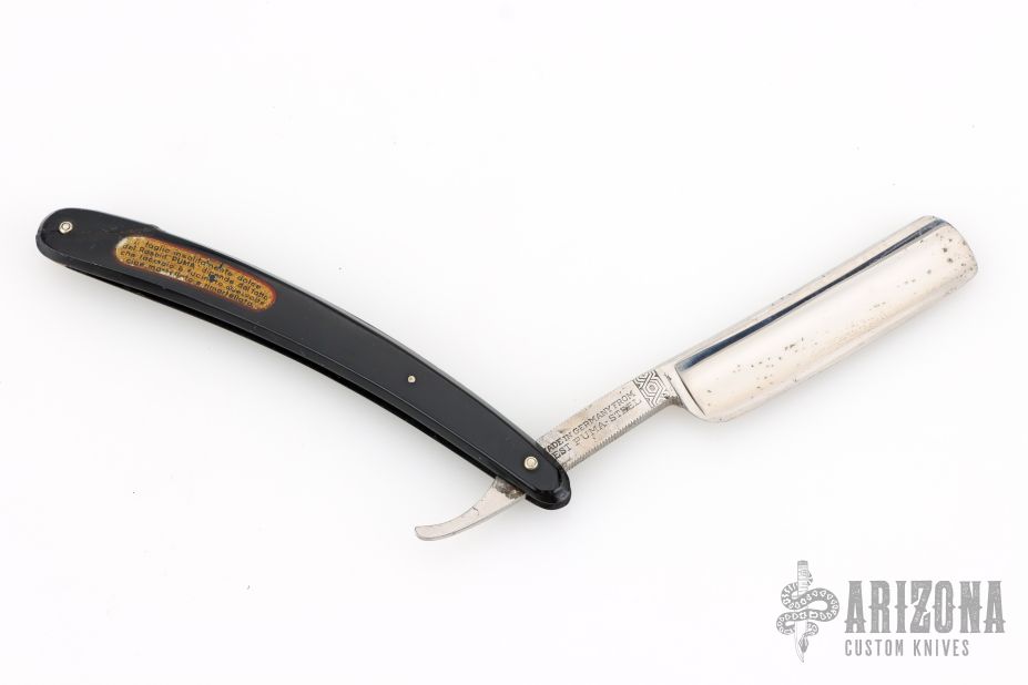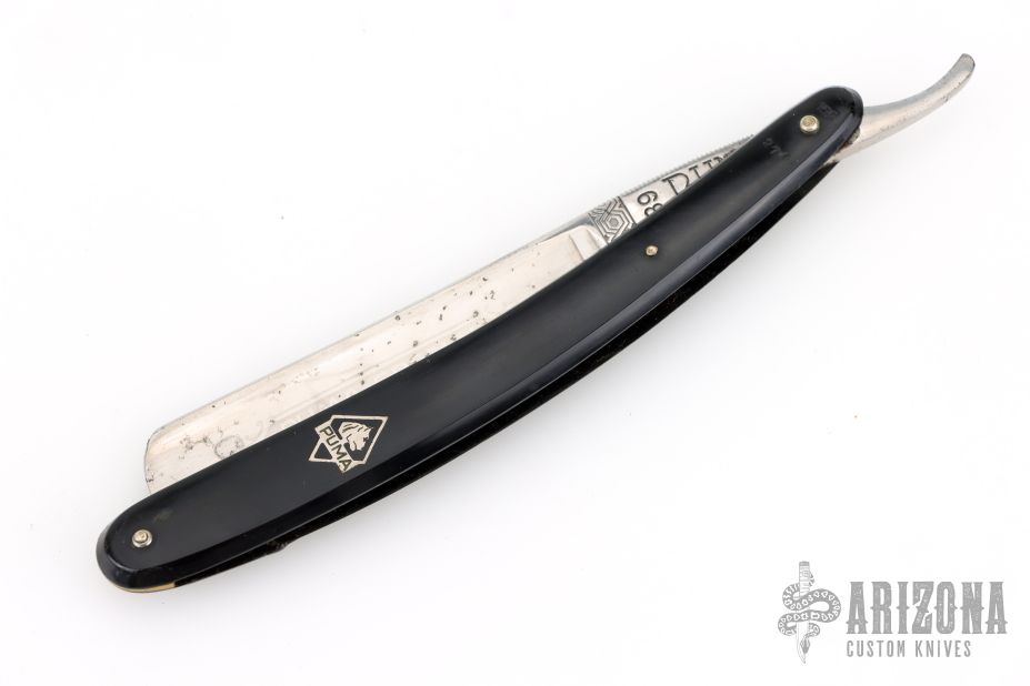 This Straight Razor by Puma features a full hollow ground, polish finished blade with a black handle. Has scuffs, scratches, and patina. Good overall condition. Has a crack on the rear scale at the pin.