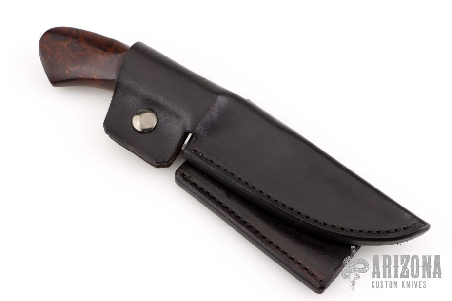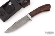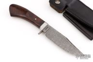 This Gent's Bowie by Master Smith Burt Foster features a Damascus blade with a false top edge, .216" blade thickness and 1.314" blade depth, hidden tang construction. The handle has a stainless steel guard with a desert ironwood burl grip. Comes with a black leather sheath. Excellent condition. Made in 2006.