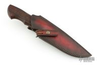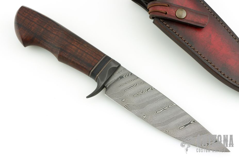This hunter by Fabrice Delbart features a Damascus blade with notched thumbrest, .173" blade stock and 1.522" blade depth, hidden tang construction. The handle has a parkerized steel guard, anodized titanium and textured black G-10 spacers, ironwood grip. Comes with a brown leather sheath, COA and zippered case. Excellent condition.