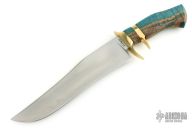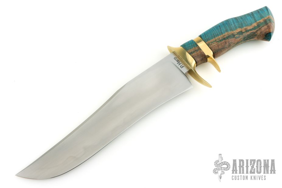 This Sub-Hilt Bowie by Patrick Harp features a hand rub satin finished blade with false top edge and light hamon, .235" blade stock and 2.015" blade depth, hidden tang construction. The handle has brass guard and sub-hilt, dyed and stabilized curly maple grip. Comes with a zippered case. Has a couple very light scratches, otherwise excellent condition.