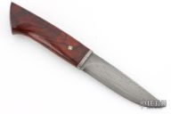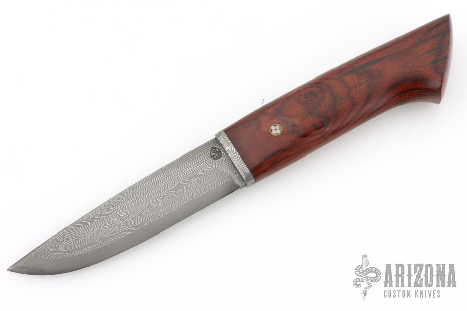 This knife by Olamic Cutlery has a Damascus blade with .170" blade stock and 1.082" blade depth, hidden tang construction. The handle has a Damascus guard and cocobolo grip with a mosaic pin. Has a couple very light scratches, otherwise excellent condition.
