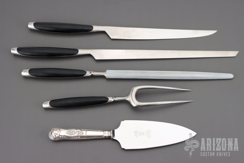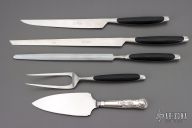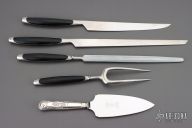 This 4-Piece Carving Set by Anton Wingen Jr features satin finished stainless steel blades with integral handles and black inlays. They have some light scratches, otherwise excellent condition for its age.