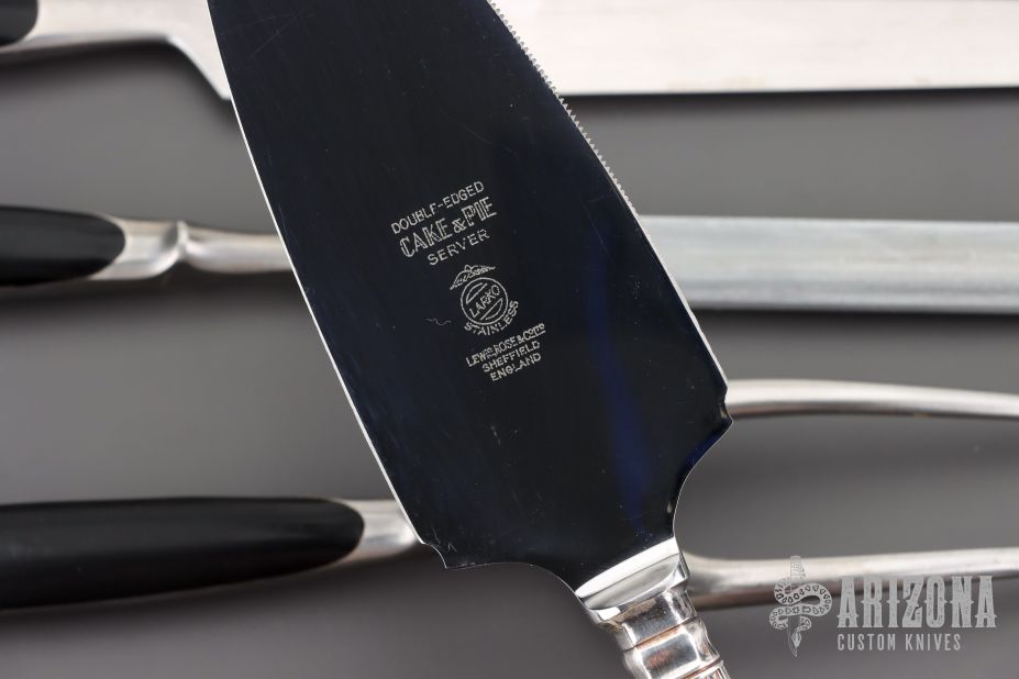 This set also comes with a Larko stainless steel Cake and Pie server that has a mirror polished double edged blade that has one serrated edge. The handle is silver. Comes with original box, although its in rough shape. Excellent condition with just a few light scratches. 5.5" blade and 10.25" overall