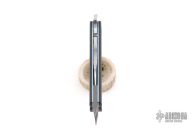 This knife was designed by Hank Greenberg and produced by Les Voorhies. It has a satin finished Scimitar blade with false top edge. The handle has carbon fiber scales, anodized titanium liners and bead blasted stainless steel skull crushers/spacers. Comes with a nylon zippered case. Has a few light scratches, excellent condition.