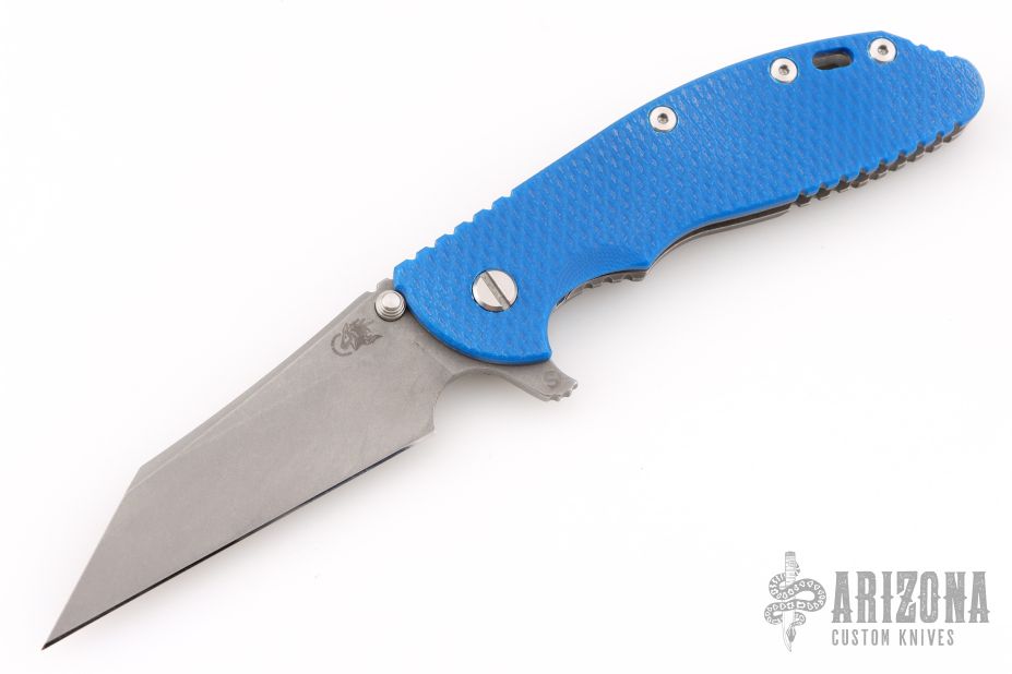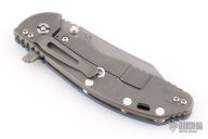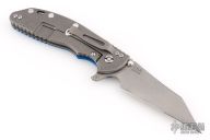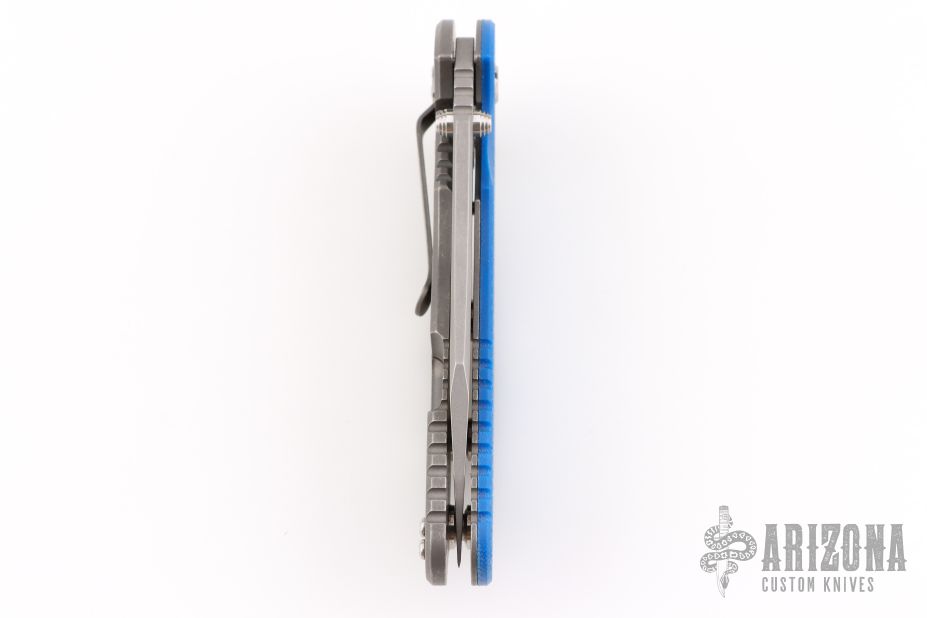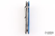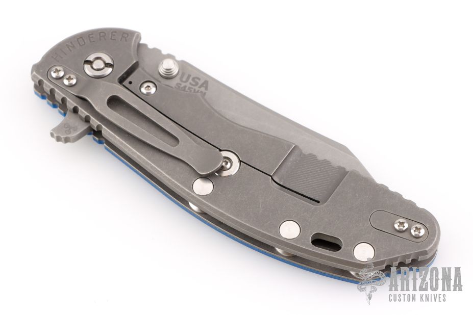 This XM-24 by Rick Hinderer features a working finished blade with swedge, dual thumb studs, notched thumb rest and flipper. The handle is comprised of a textured blue G-10 scale over titanium liner on the "A" side and a tumbled titanium lock side over titanium barrel spacers. The tumbled titanium pocket clip is reversible for tip up/down, right hand carry. Includes original box, papers, and extra washers. Has a few light scuffs, otherwise excellent condition.