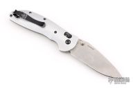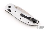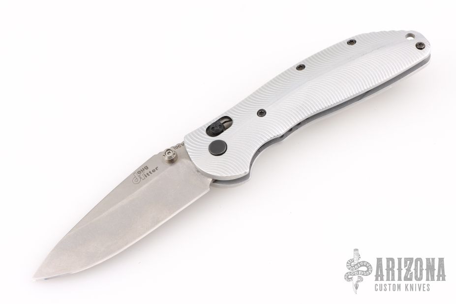 This Doug Ritter RSK by Hogue Knives features a stonewashed blade with notched thumbrest and dual thumbstuds. The handle has milled aluminum scales with a stainless steel tip up reversible clip. Comes with original zipper case and orange covers. Has some scuffs and scratches, great overall condition.