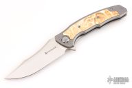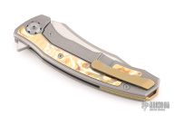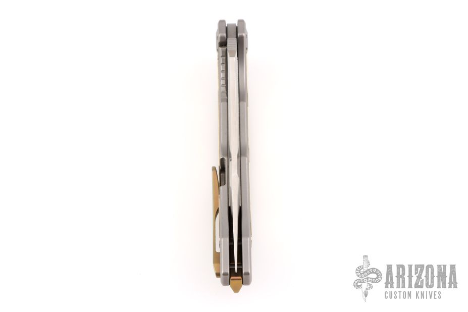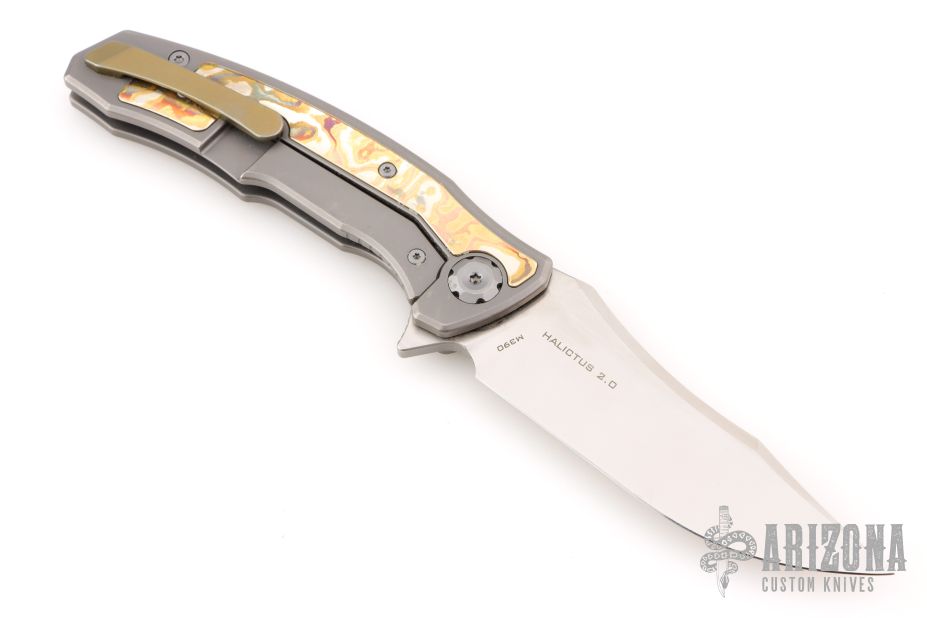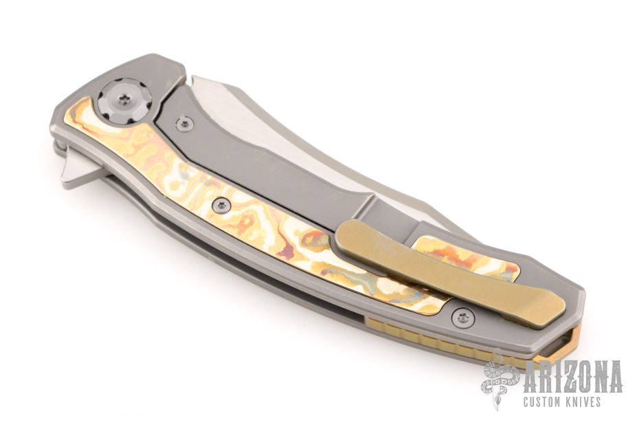 The Maxace Halictus 2.0 features a satin finished blade with flipper. The handle has a bead blasted titanium frame with mokume inlays, anodized titanium backspacer and tip up clip with hidden screws. Rides on bearings, nice detent, lockup and blade seating. Has a couple light scuffs and scratches, great overall condition.
