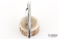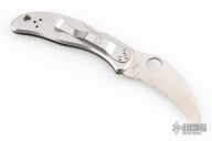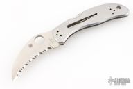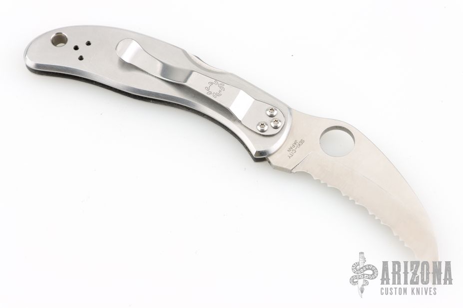 This Harpy by Spyderco features a hawkbill fully serrated blade with thumbhole. The handle has a stainless steel frame with tip down stainless clip. Lanyard hole. Has some scratches, great overall condition.