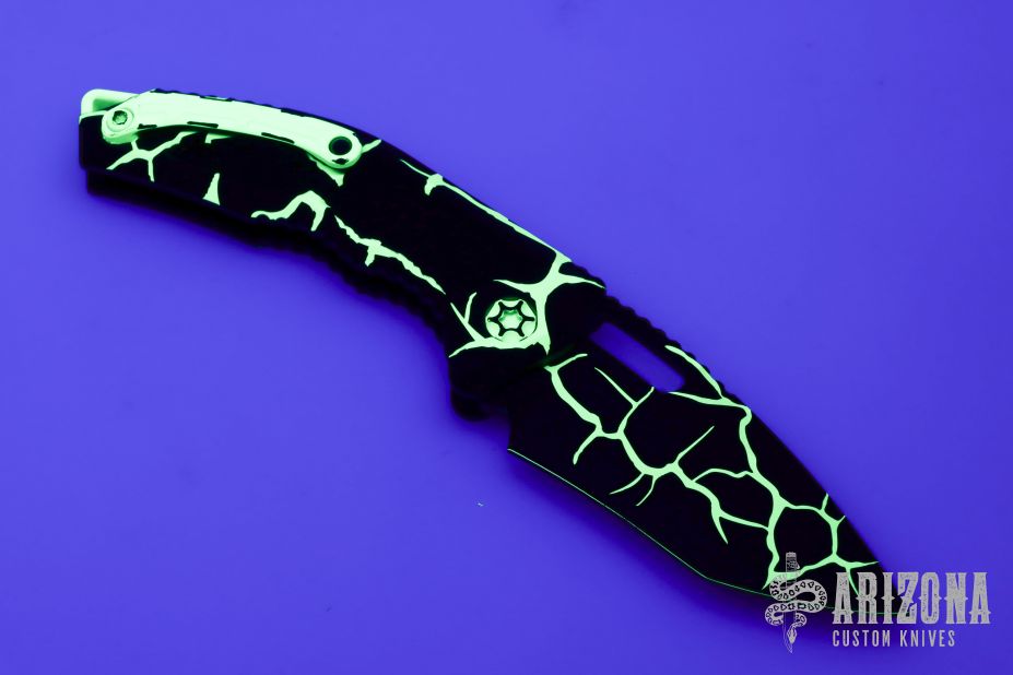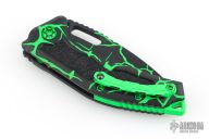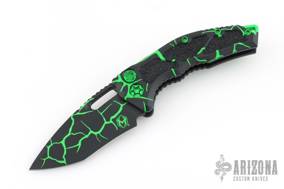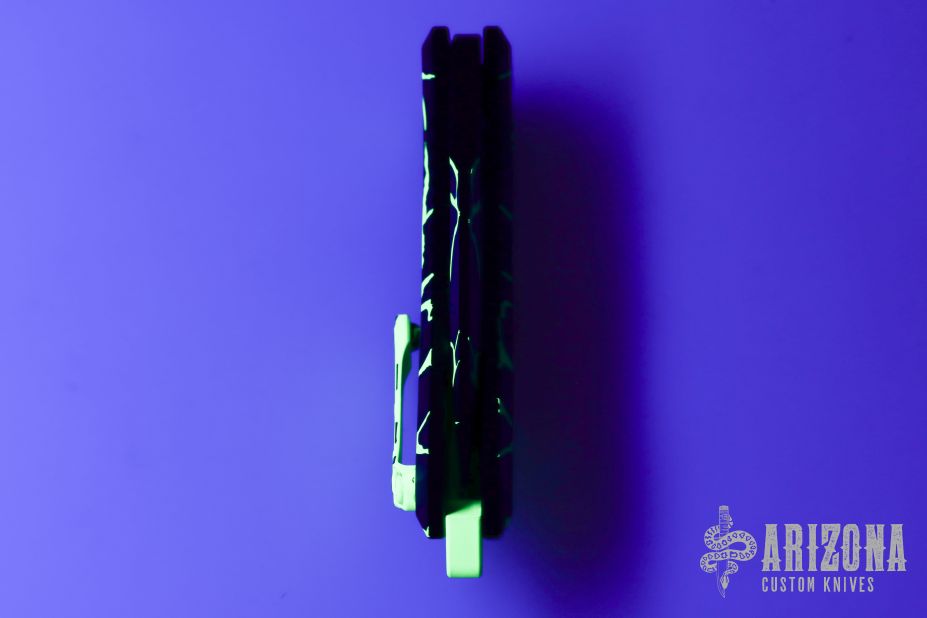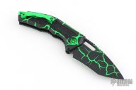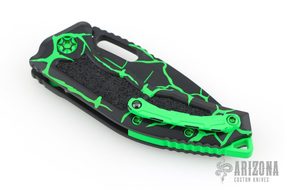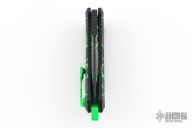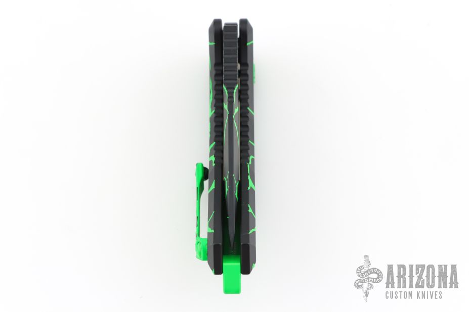 This Medusa by Heretic Knives features a black recurve blade with false top edge and notched thumbrest. The handle has a black aluminum frame with checkered push button, green backspacer and a tip up stainless steel clip with ball. Comes with original box. New condition. #123 and dated 08/2025