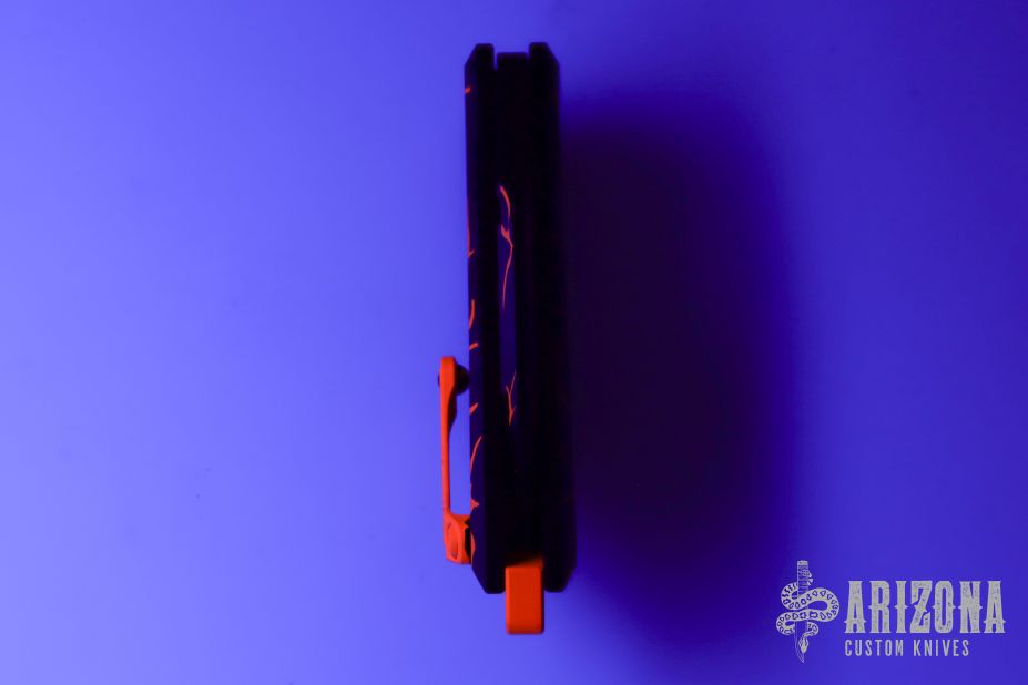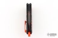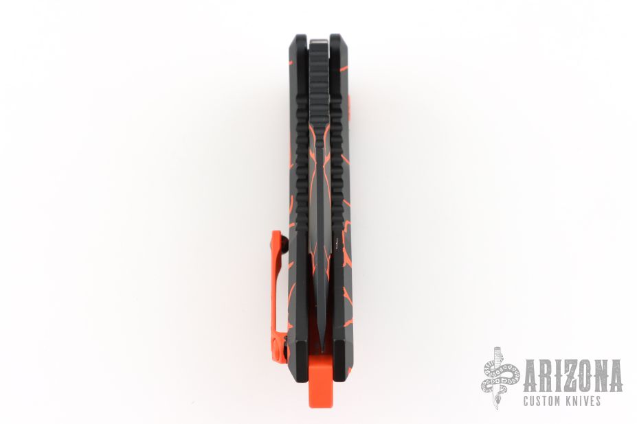 This Medusa by Heretic Knives features a recurve blade with false top edge and notched thumbrest. The handle has a black aluminum frame with checkered push button, orange backspacer and a tip up stainless steel clip with ball. Comes with original box. New condition. #068 and dated 08/2025
