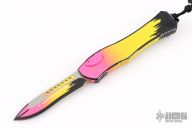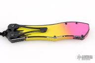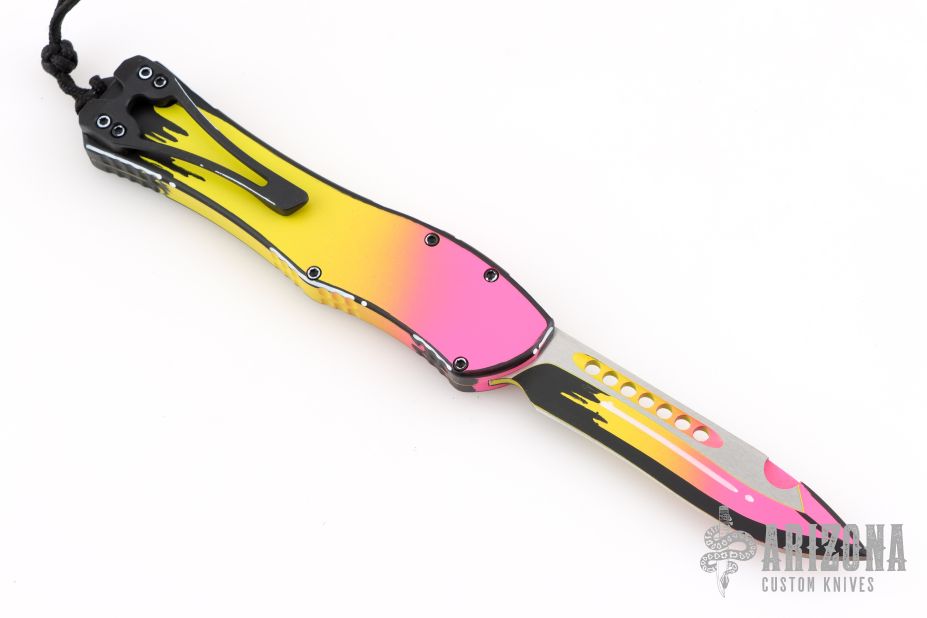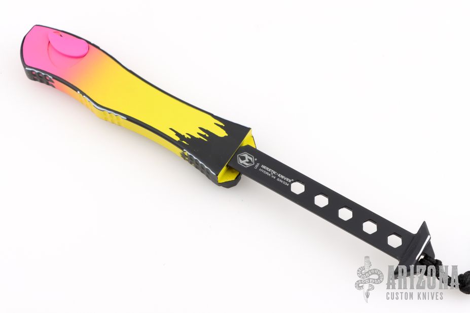 This Hydra by Heretic Knives (Anthony G. Marfione) features a "Pink Lemonade" finished recurve blade. The handle has a matching "Pink Lemonade" finished aluminum frame, stainless clip, black charging handle. Comes with original box and lube. S/N 034. New condition.