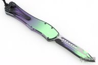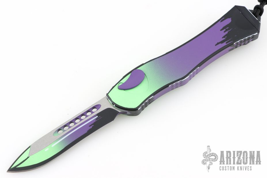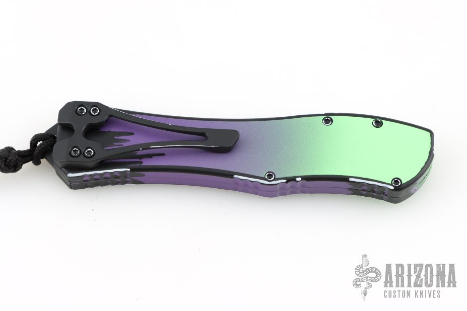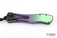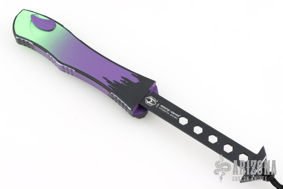 This Hydra by Heretic Knives (Anthony G. Marfione) features a "Frankenstein Monster" finished recurve blade. The handle has a matching "Frankenstein Monster" finished aluminum frame, stainless clip, black charging handle. Comes with original box and lube. S/N 063. New condition.