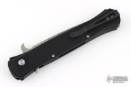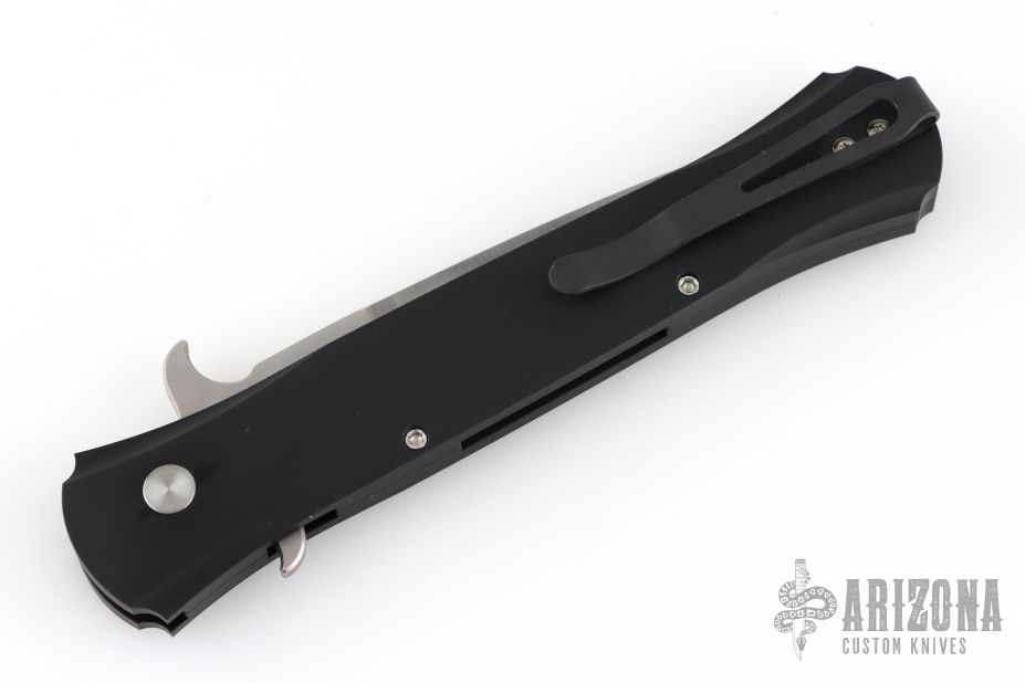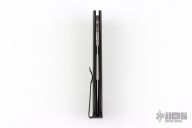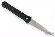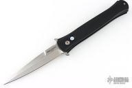 This Large Don by Pro-Tech features a stonwash finished blade with false top edge. The handle has a black aluminum handle with black tip up stainless steel clip. Comes with original box, pouch, and papers. Excellent condition. Mother of pearl button.