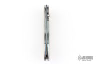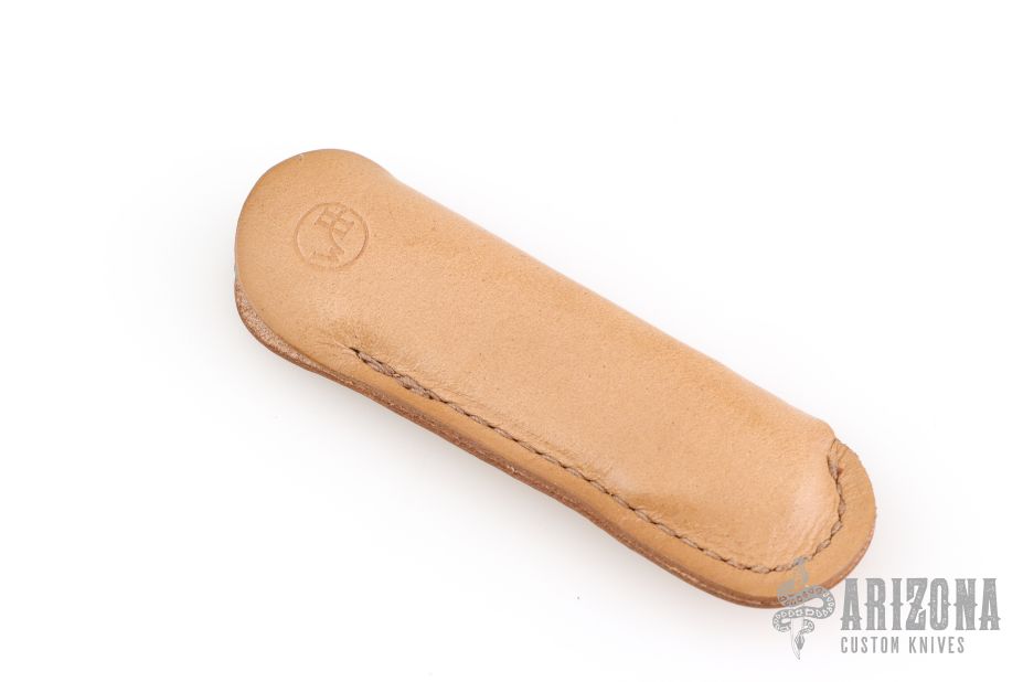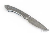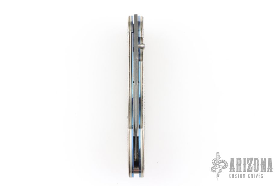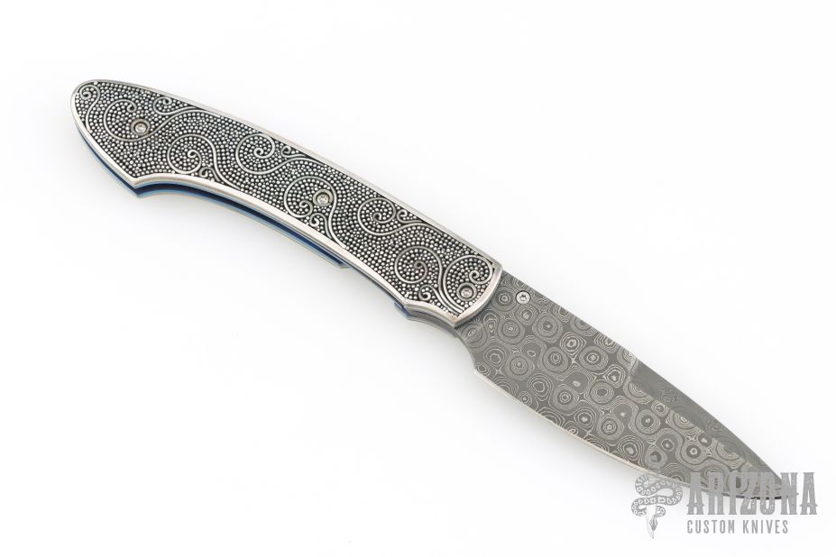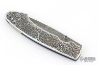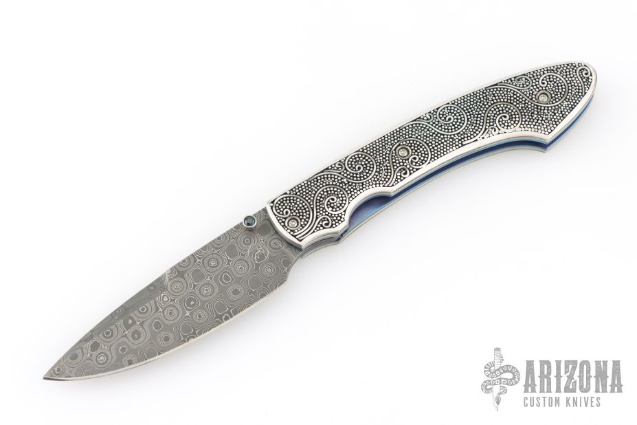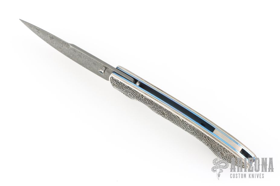 This T12 Linerlock Folder by William Henry has a Mike Norris stainless Damascus spear point blade with false top edge and single thumb stud with opal inlay. Handle has sterling silver scales, anodized titanium liners, satin finished titanium backspacer, lanyard bail. Comes with original box, papers and brown leather pocket sheath. Excellent condition.