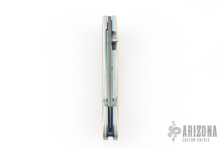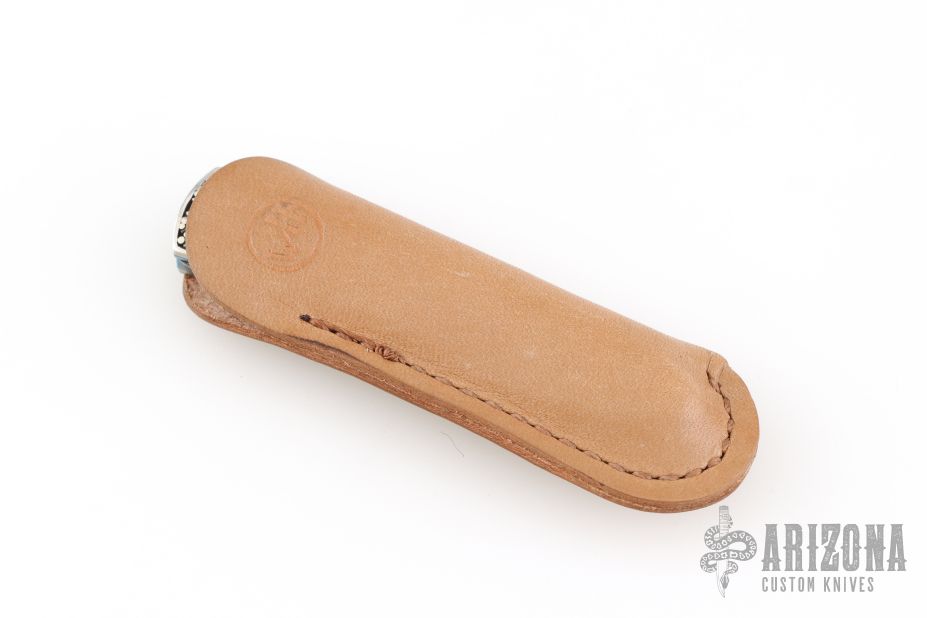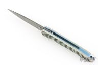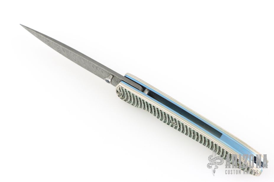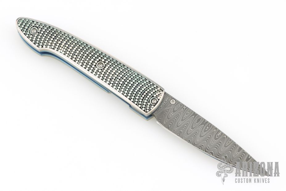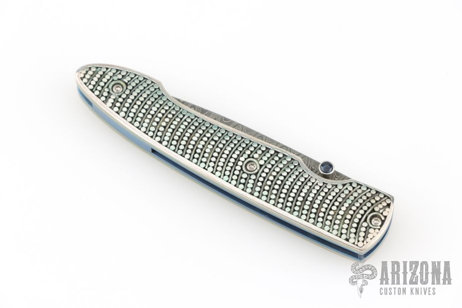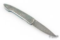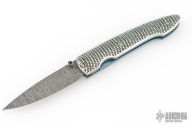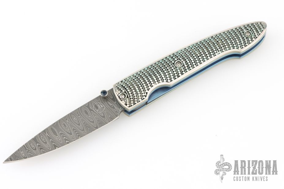 This T10 Ripple from William Henry Fine Knives features a drop point Stainless Damascus blade with single thumbstud with sapphire inset. The handle is comprised of sterling silver scales over anodized titanium liners and backspacer. Numbered 50/100 inside backspacer. Good blade seating, detent and lock up. Includes original leather pocket sleeve, box and papers. Excellent condition.