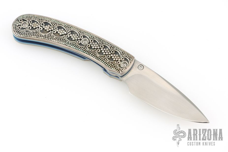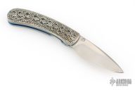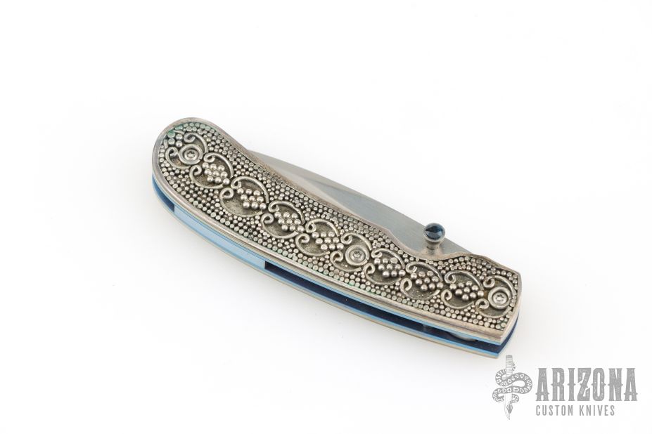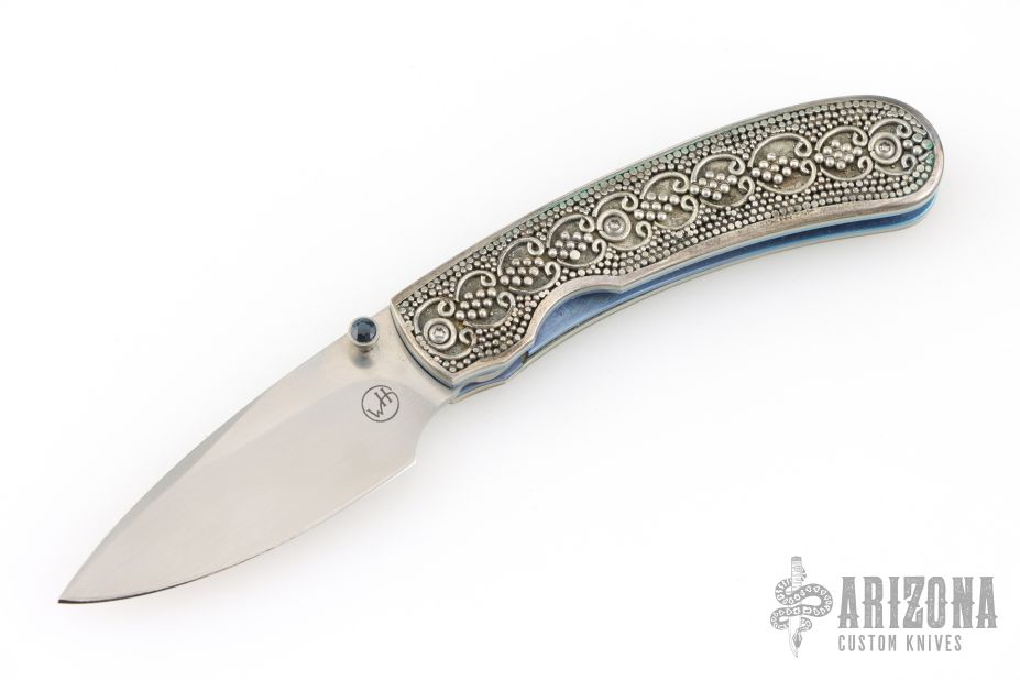 This T09 Sterling One of a Kind by William Henry features a hand rub satin finished blade with single sapphire inlaid thumbstud. The handle has an anodized titanium frame with sterling silver scales. Comes with original box, papers, and leather sheath. Excellent condition. One of a kind.