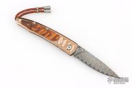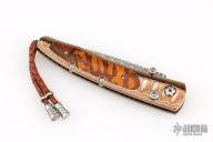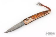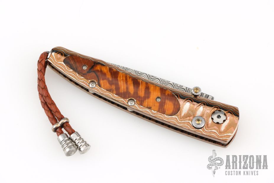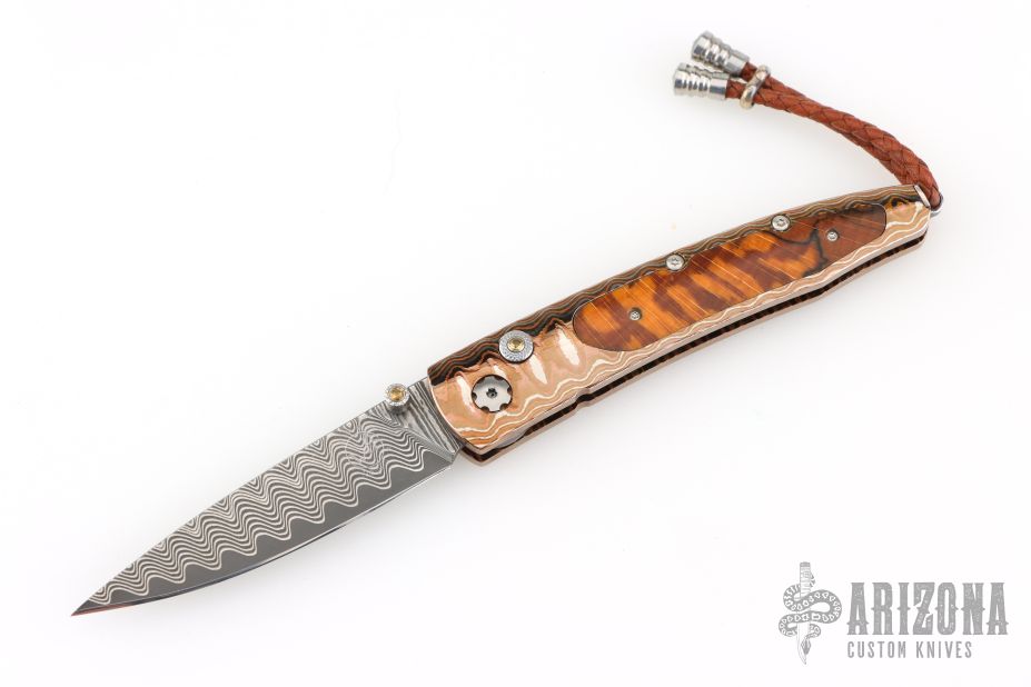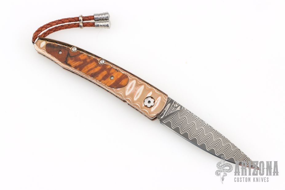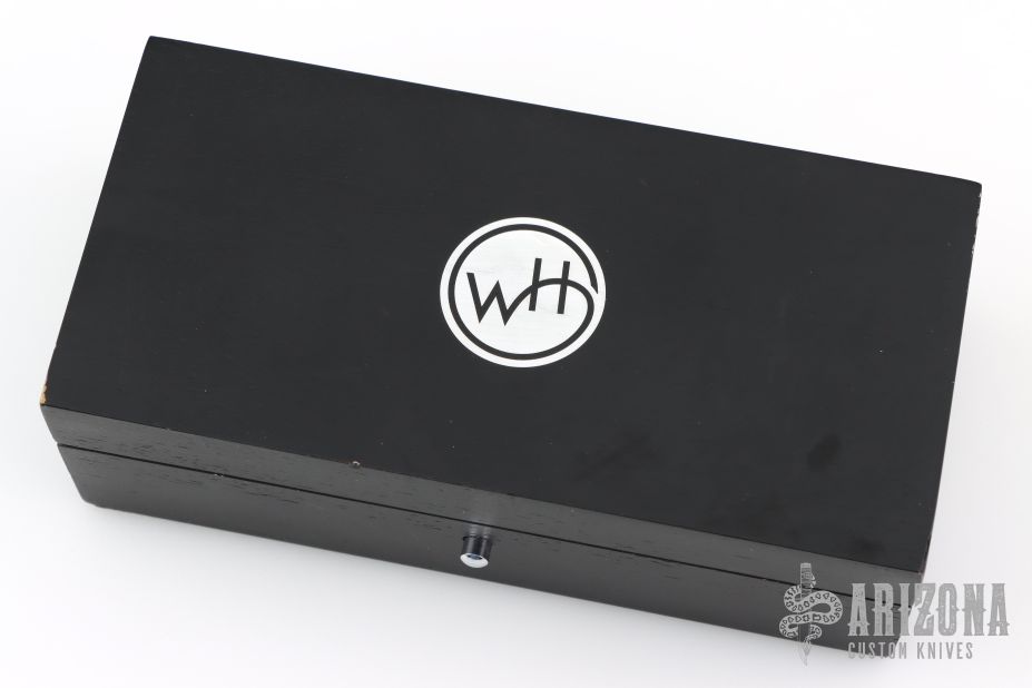 This William Henry is about style and performance. Sleek, light, tough, and elegant, each of these knives showcases the unmatched sharpness of ZDP-189 laminate blade steel with the durability of Wave Mokume handles with spalted Beechwood inlays. Citrine inlays in the thumb stud and button lock. Comes with original box, papers and leather pocket slip sheath with stainless clip. Excellent condition. 146/250 and dated Oct 10, 2023.