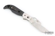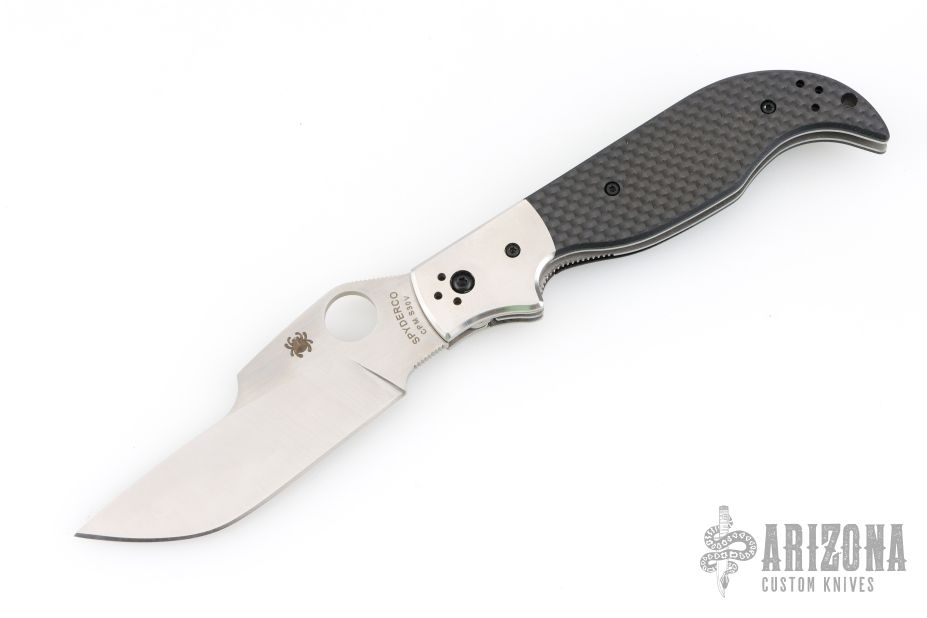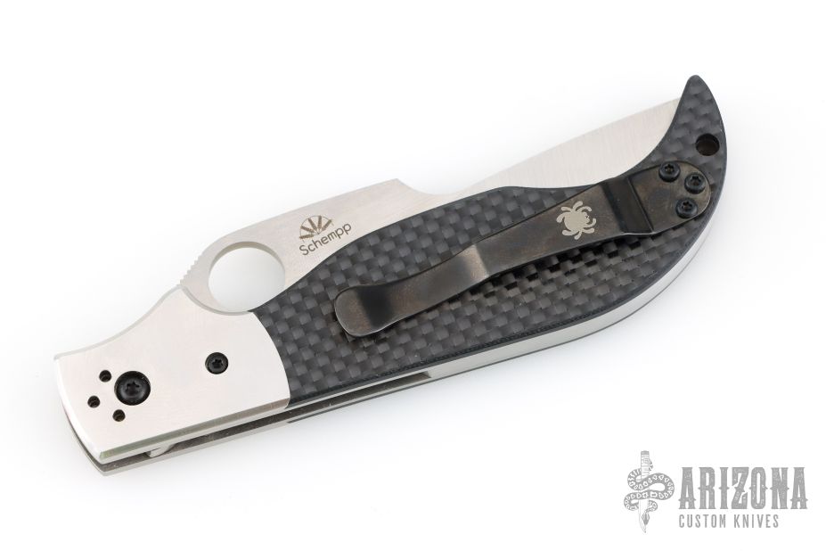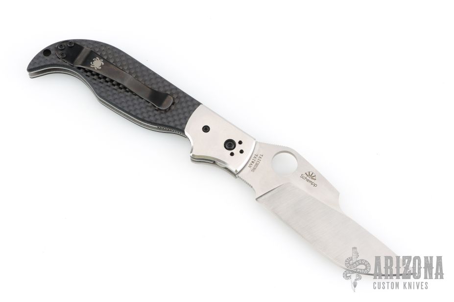 This Navaja by Spyderco was designed by Ed Schempp. It features a satin finished blade with notched thumb and index rests, thumbhole opening. The handle has satin stainless steel bolsters, carbon fiber scales, stainless liners and backspacer, and a black tip up stainless steel clip. Nice detent, lockup and blade seating. Comes with original box. Excellent condition.