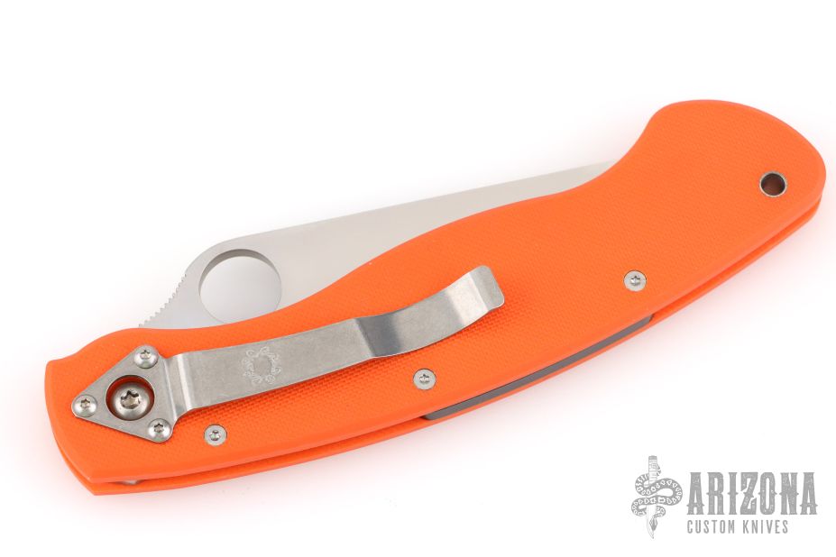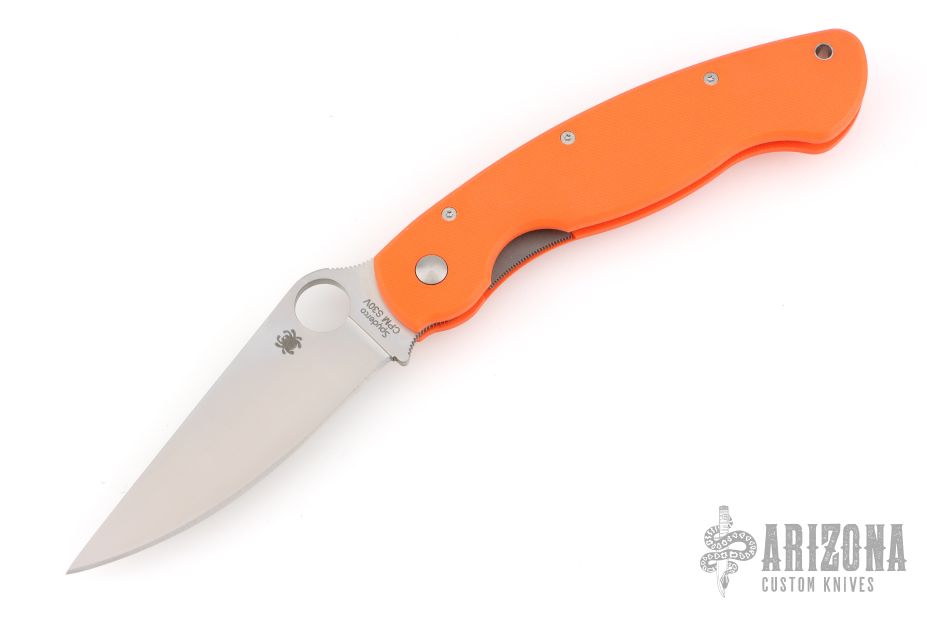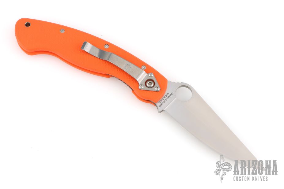 The Military folder from Spyderco has been in production since the 1990s in a variety of steels, materials and colors. This linerlock Military folder has a satin finish S30V blade and orange G10 scales. Blade choil and thumbrest are jimped for better control. The oversized blade hole makes opening a natural and smooth action even if wearing gloves. Stainless steel tip down carry clip. Comes with original box and papers. Excellent condition.