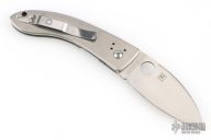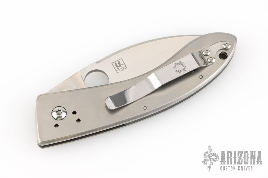 This Bob Lum Chinese folder by Spyderco has a satin finished blade with thumbhole. The handle has titanium scales and a stainless steel liner, SS clip. Comes with original box and papers. New condition. Still has plastic cover over the front scale.