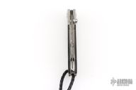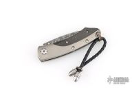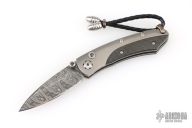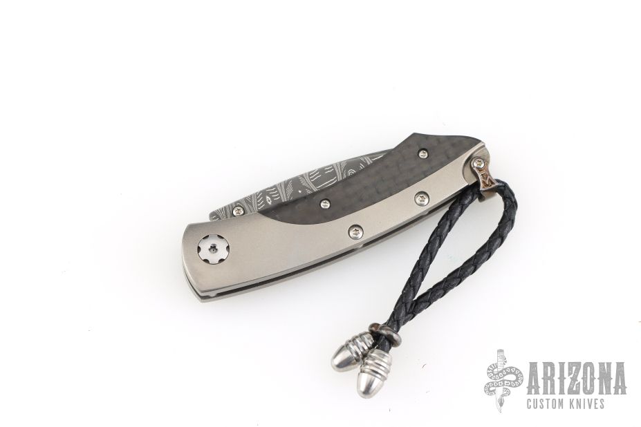 Compact luxury folding knife featuring an aerospace-grade titanium frame with carbon fiber inlays and a hand-forged “Hornets Nest” Damascus blade by Mike Norris. Accented with gemstone-set button lock and thumb stud. Includes original box and papers. Excellent condition.