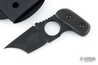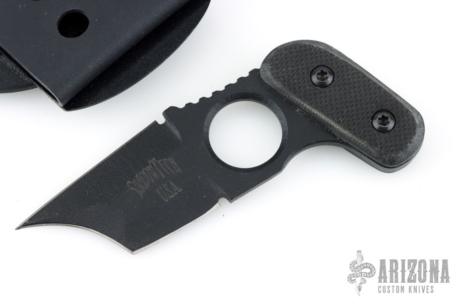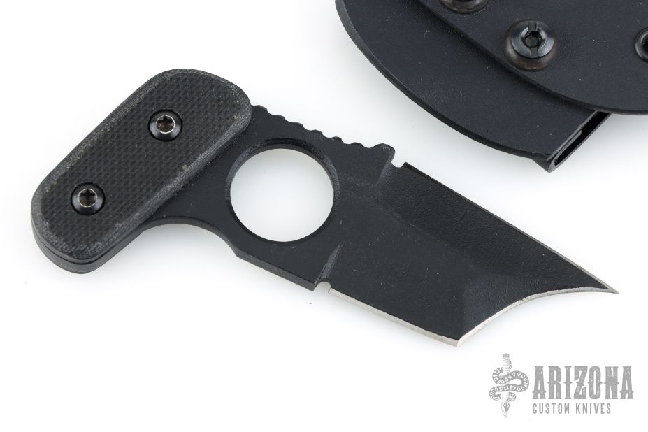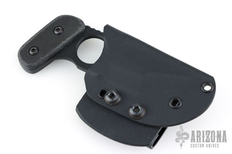 This push dagger features a black coated double edged blade with notched thumbrest, .204" blade stock, 1.572" blade depth, full tang construction. The handle has black G-10 scales. Includes kydex sheath with belt clip. Excellent condition.