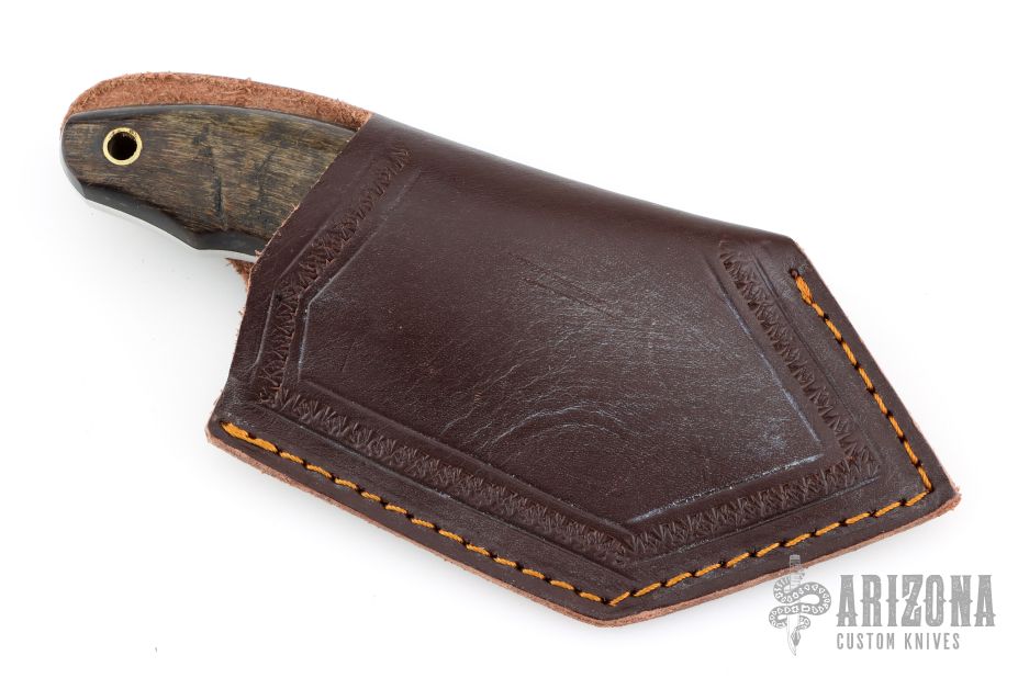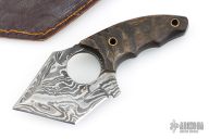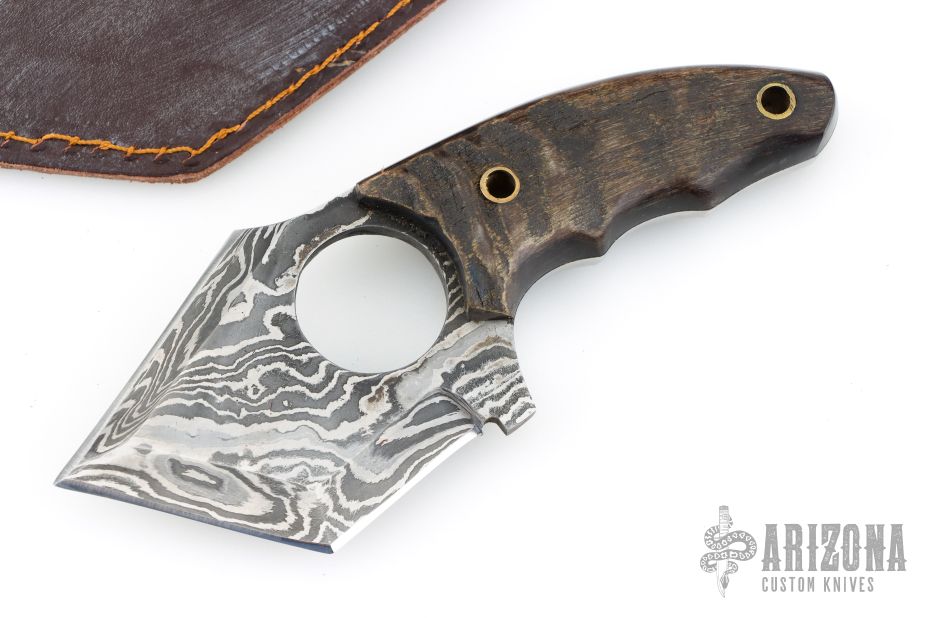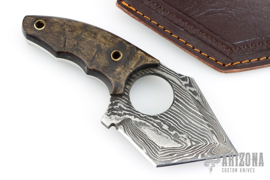 This Punch Knife features a Damascus double edged blade with finger hole, .175" blade stock, 2.212" blade depth, full tang construction. The handle has buffalo horn scales. Includes a brown leather sheath. Excellent condition.