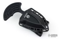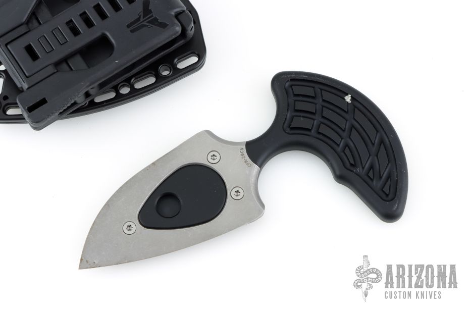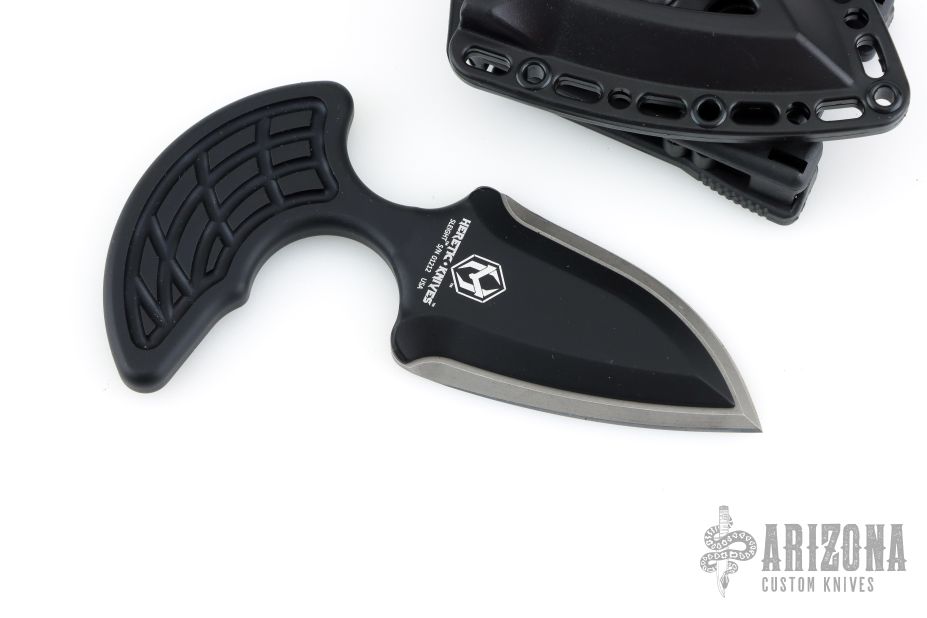 This Sleight push dagger by Heretic Knives features a chisel ground double edged Battleworn blade that is attached to a black aluminum handle. Overall thickness is .350" and has a blade depth of 1.680". Comes with a molded polymer sheath with TekLok. Has a couple light spots on the blade, otherwise excellent condition.