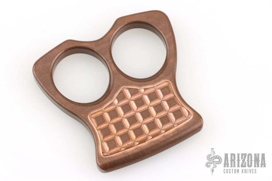 This dirty copper two-hole Paperweight from Microtech features a 0.960" finger holes and milled frag patter. 0.374" thick. Excellent Condition.