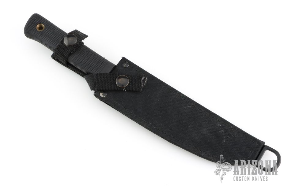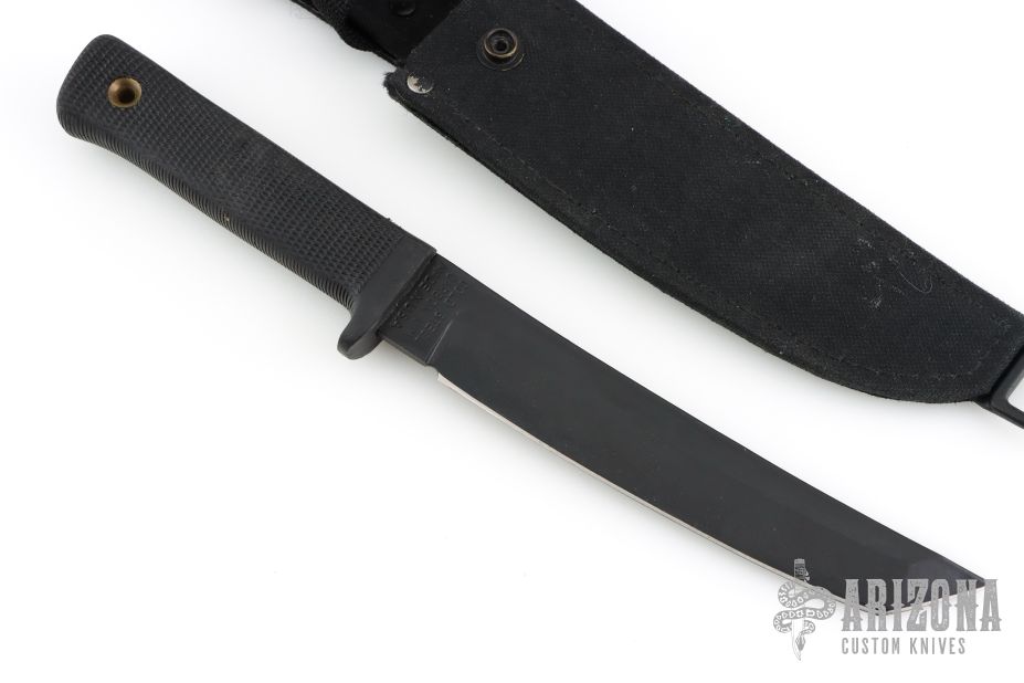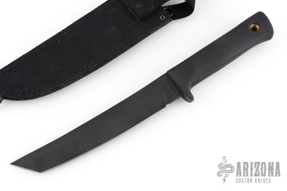 This Recon Tanto from Cold Steel features a black coated tanto blade, .200" blade stock and 1.205" blade depth, hidden tang construction. The handle is comprised of textured kraton over hidden tang construction. Comes with original black sheath with belt loop. Has some light scuffs, otherwise excellent condition.