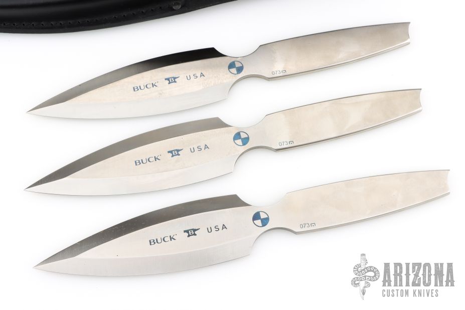 Originally requested by Chuck Buck himself for an outside picnic game at his church, these knives were first created in 2005 but never introduced to the public. This year, after extreme testing and a couple refinements, Buck Knives is excited to introduce this three piece throwing knife set. Specifically designed for efficient throwing, these knives feature durable 420HC steel with corrosion resistance. With an overall length of 9.875" and weighing 6.6 ounces, these knives are well balanced for accuracy and efficiency. The knives fit perfectly in a heavy duty leather sheath for easy transport and storage.