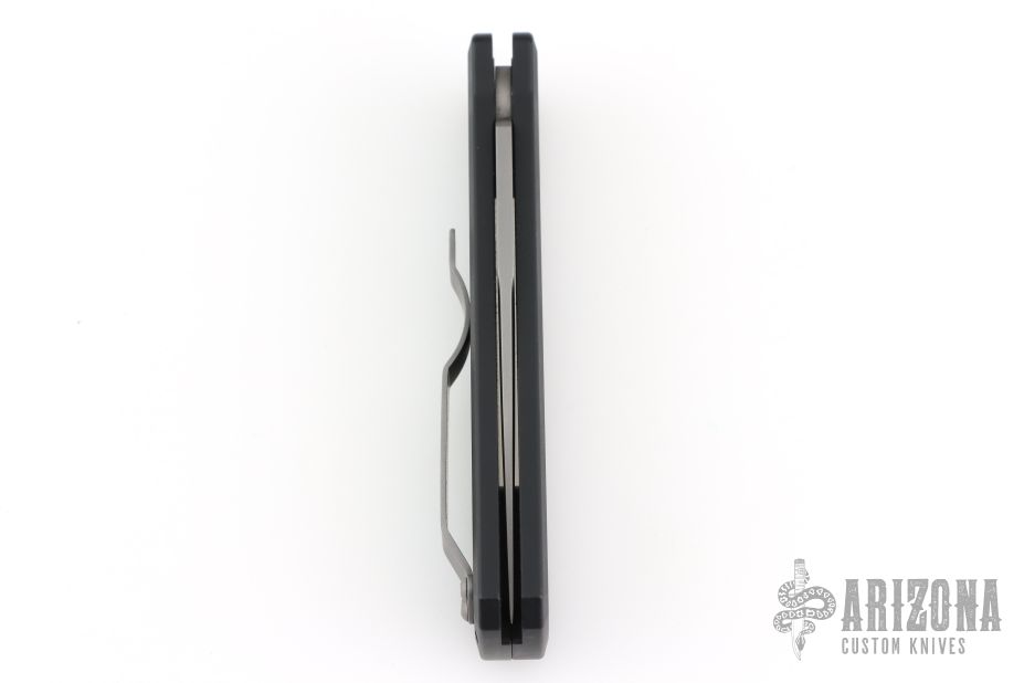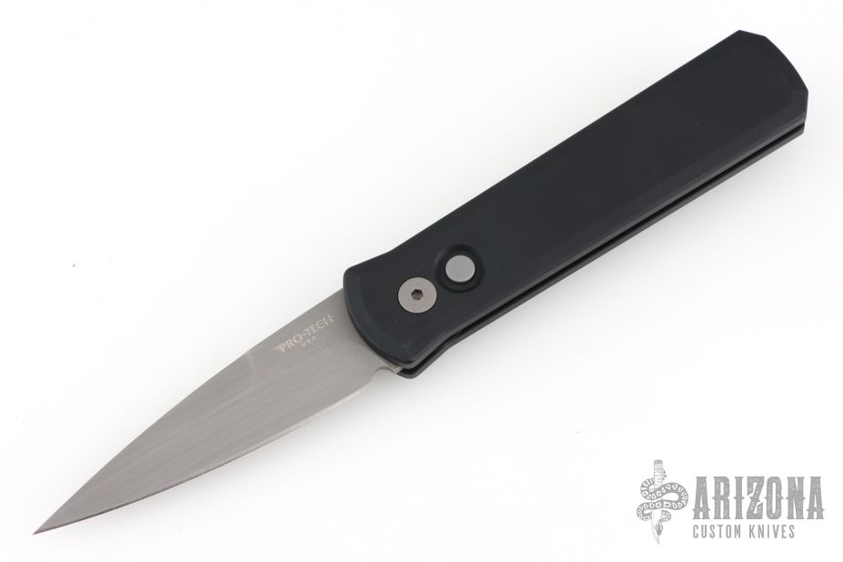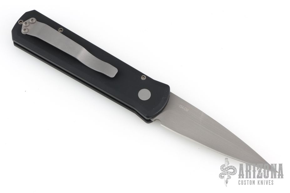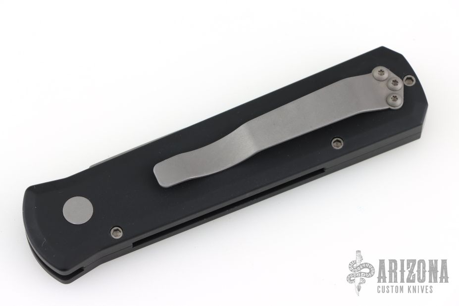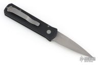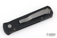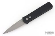 This 720 Godson from Pro-Tech Knives features a bead blasted blade with swedge. The handle has a black aluminum frame with bead blasted button, pivot and tip up clip. Comes with original box and papers. Has some light scuffs and scratches, great overall condition.