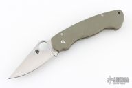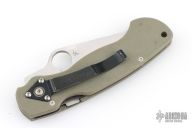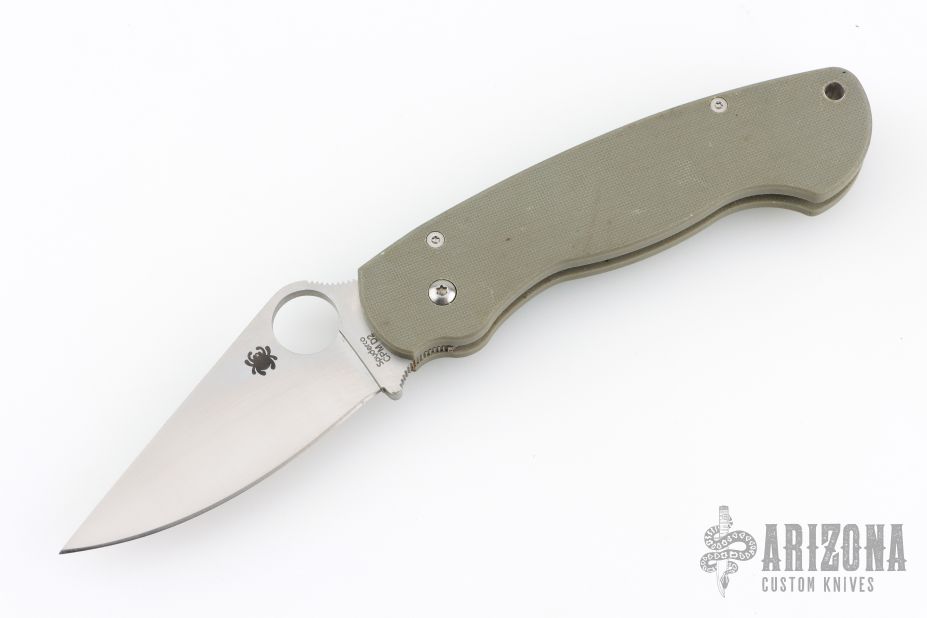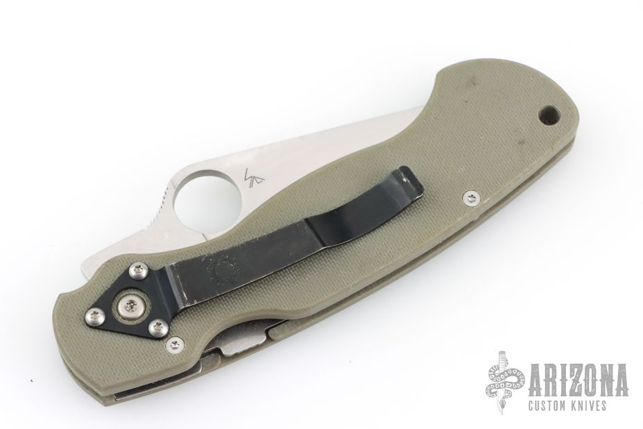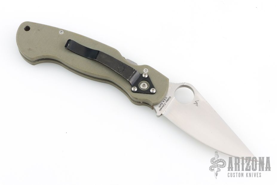 The Spyderco Para Military Model with a foliage green G-10 handle with a powdered metallurgy steel technology, CPM-D2 blade. The foliage green G-10 handle expands at the butt end, keeping the hand from slipping forward or backward. We topped the package off with a nested Compression Lock making the ultimate mid-sized survival knife. The black metal pocket clip carries tip-down. Made in Spyderco's Golden plant.