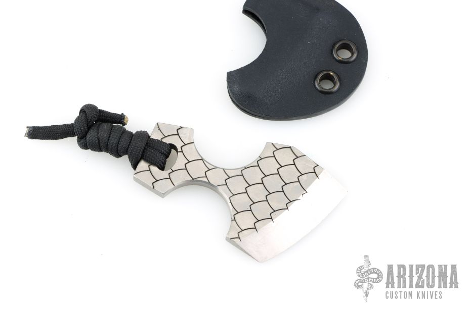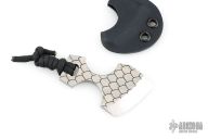 Designed to be a small cutting tool or a backup defensive weapon that is easily carried anywhere, this spunk from Mummert Knives delivers an amazing amount of cutting ability in a small package. The Spunk is constructed out of .195” thick 6Al-4V titanium with tungsten carbide fused to the edge attaining a rockwell hardness of 72 at the razor sharp edge.  Comes with a custom Kydex neck sheath with double chain holes for twist-free wear. Excellent condition.