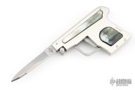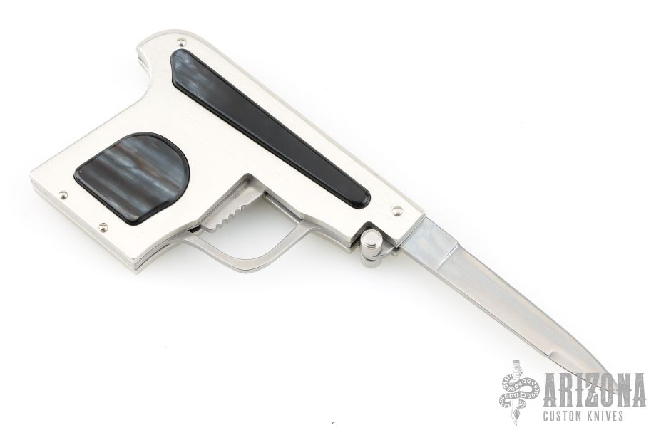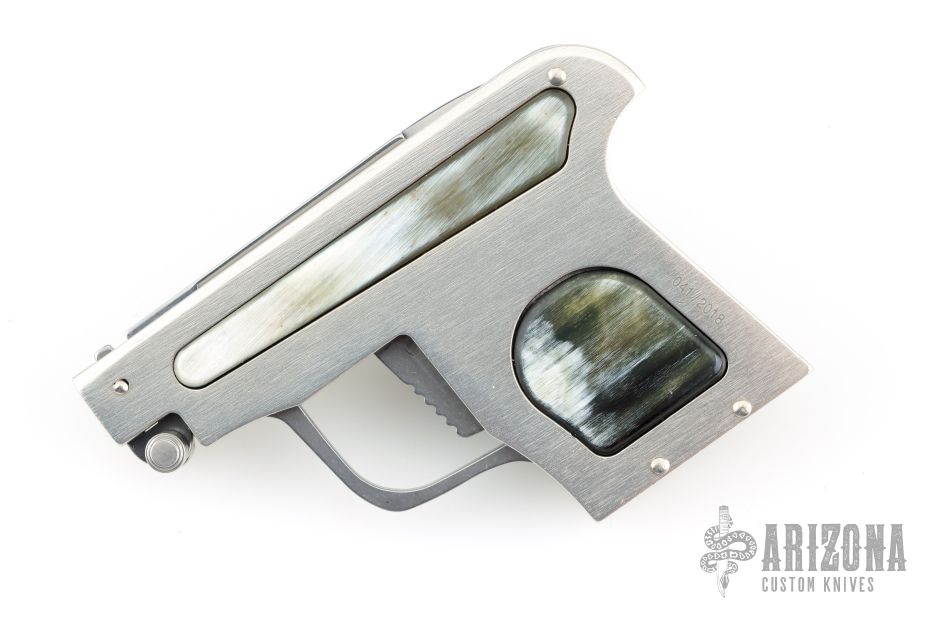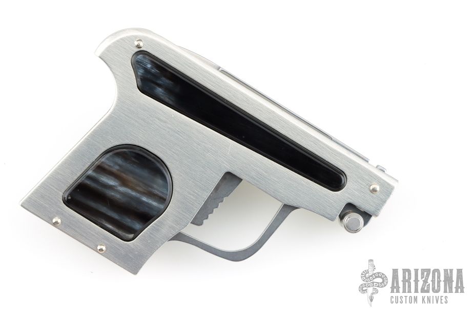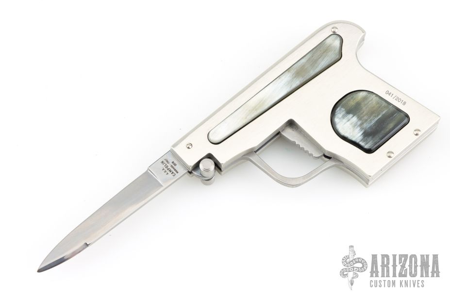 This special automatic knife is a remake of the old Maniago gun-letter opener made on 50's. The handle is made of aircraft anodized aluminum with Brazilian cow horn inlays, and the blade of 440C steel. This knife is not for EDC use, but for collectors who like a piece of Italian knife history or like a letter opener. Excellent Condition. Dated 2018 and s/n 041.