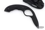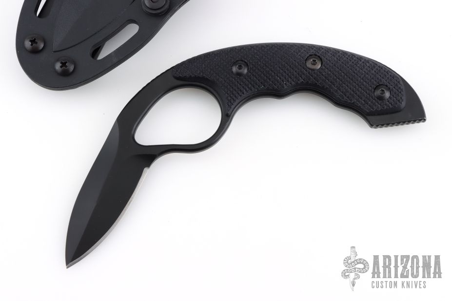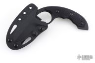 Fixed blade is precision machined from 8Cr14MoV, with black titanium nitride finish. Grips are injection molded with squared surface edges to help prevent grip from twisting inside your hand. The sheath is injection molded featuring black oxide coated stainless steel fasteners for tension adjustment and a black titanium nitride coated stainless steel belt clip.