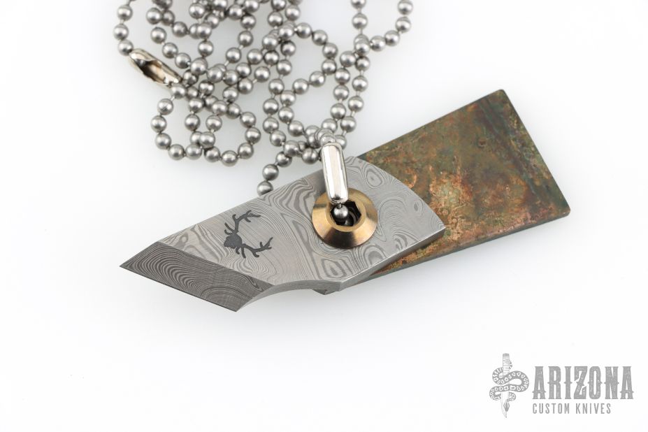 Swivel DogTag Knife from Kingdom Armory. Patina copper handle. Chisel ground Damascus blade. Includes steel bead chain. Excellent condition.