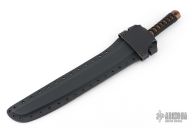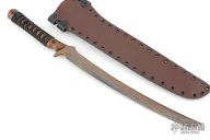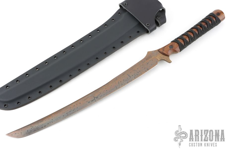 This sword by Dawson Select features an unswept blade with false top edge and notched thumbrest, .205" blade stock and 1.250" blade depth, full tang construction. The handle has desert ironwood scales with black wrapped cord. Comes with a brown leather and kydex sheath. Excellent condition. #031 on the blade.