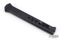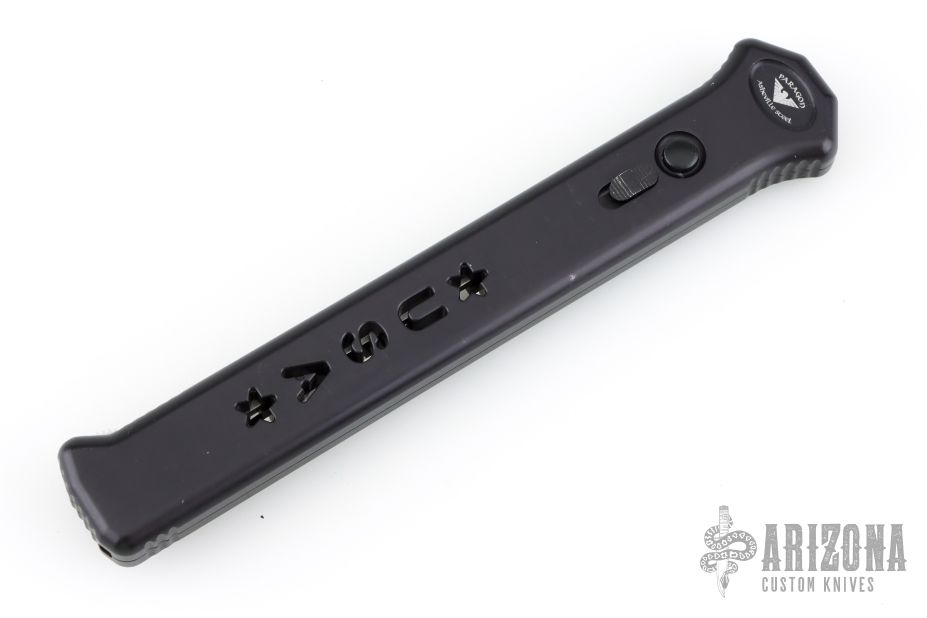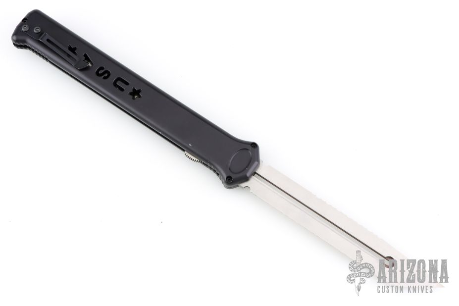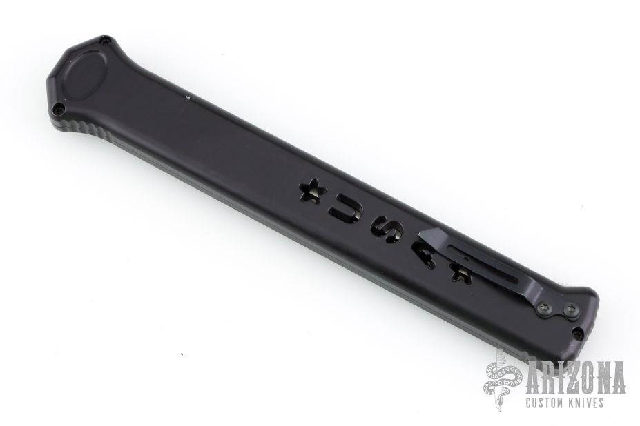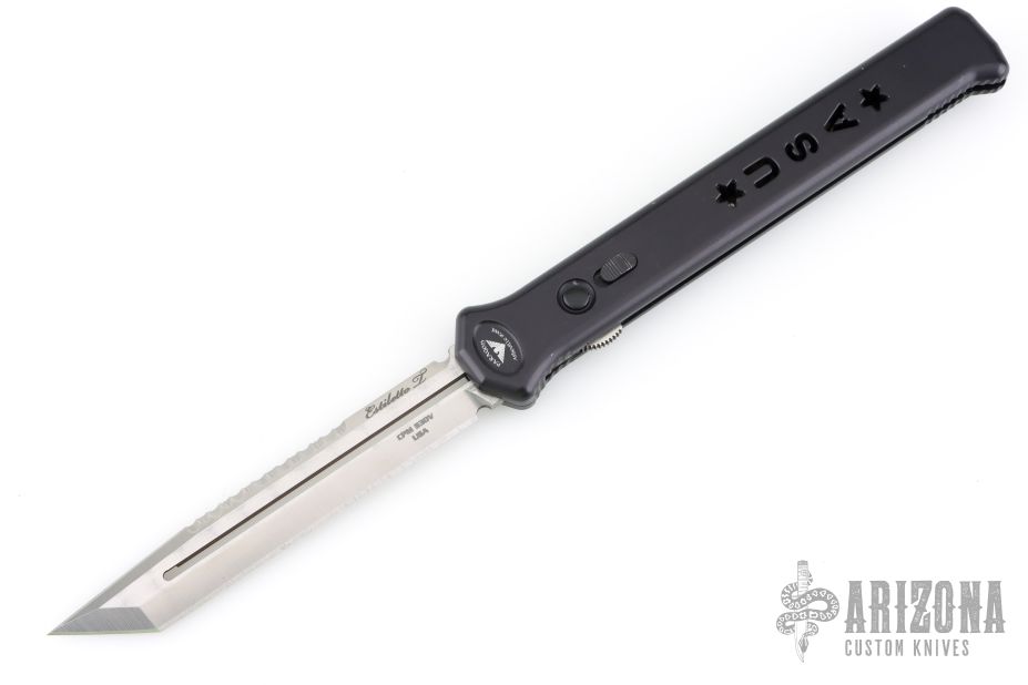 Joining the Estiletto OTF lineup is this fantastic model with a USA cutout on the black anodized aluminum body with black hardware/clip and a tanto partially serrated blade.
