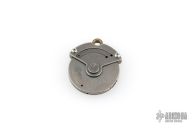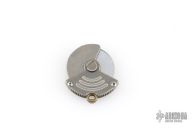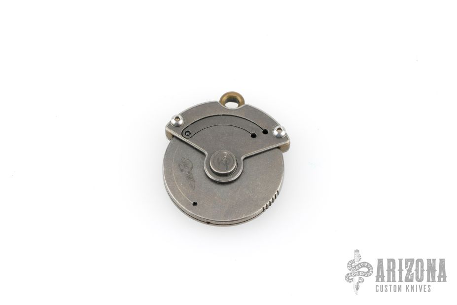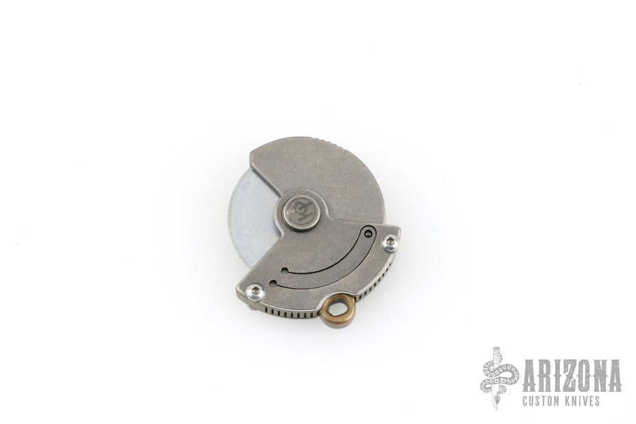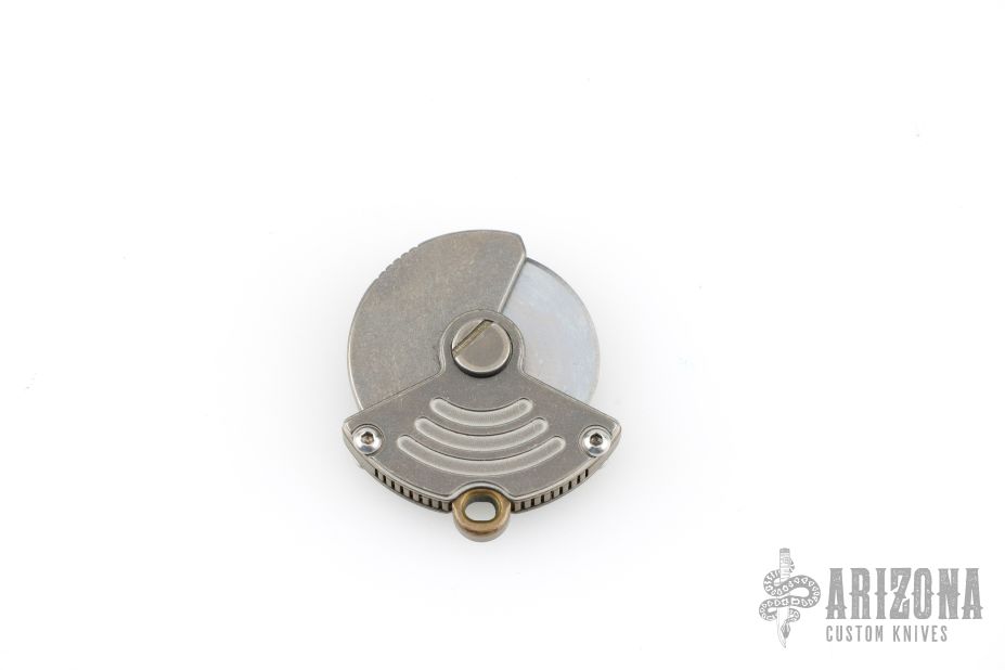 This Whorl by Darriel Caston features a chisel ground blade. The handle is composed of titanium. This is a pocket-sized pizza cutter, perfect for picnics and potlucks. Excellent Condition.