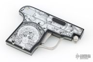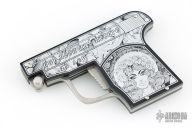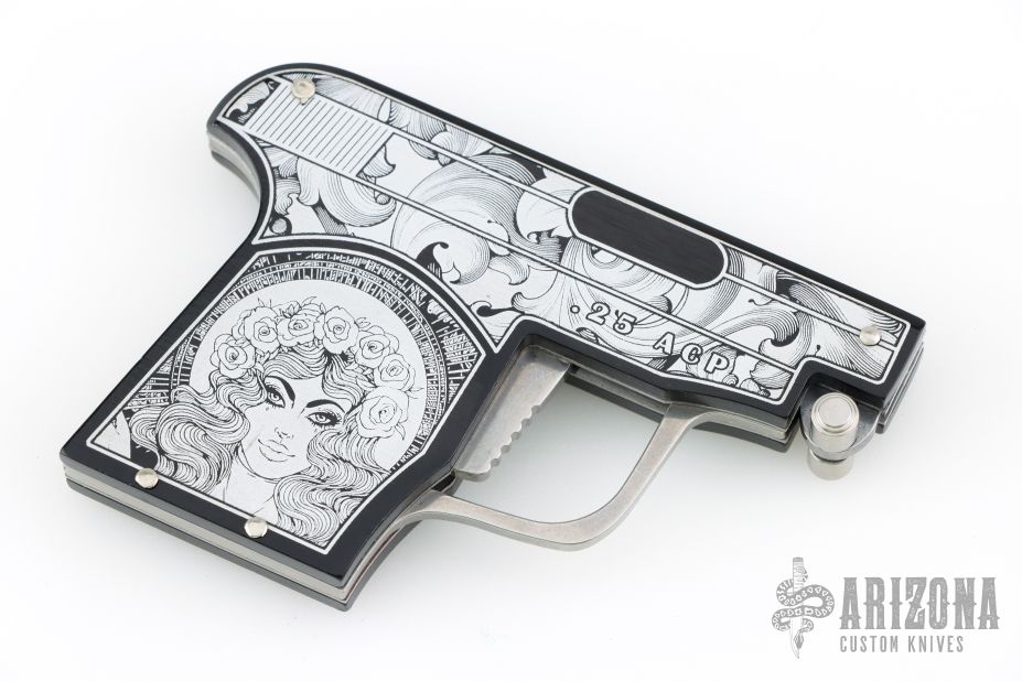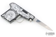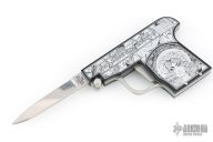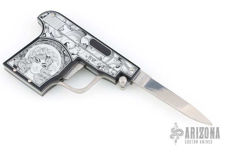 This special automatic knife is a remake of the old Maniago gun-letter opener made on 50's. The handle is made of black aircraft anodized aluminum and the blade of 440C steel. This knife is not for EDC use, but for collectors who like a piece of Italian knife history or like a letter opener. The artwork is by JB. Excellent Condition.