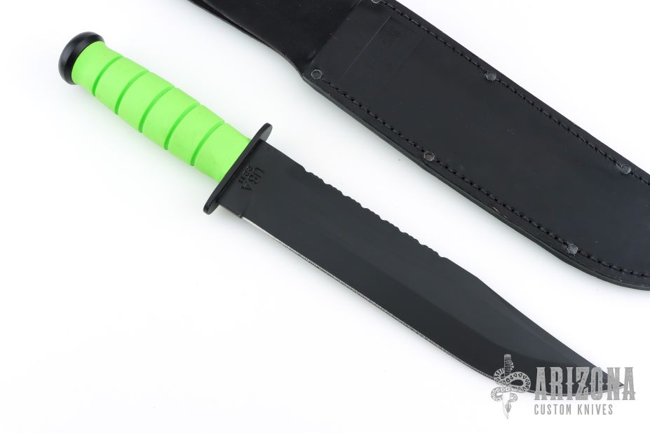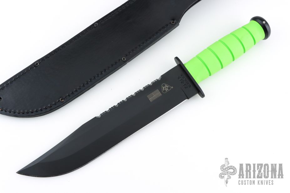 Designed in cooperation with the highly-trained folks at S.E.I.G.E. (Strategic Edge Impact Global Enterprise) of Webster, NY, the high-carbon, non-reflective black blade of the Zombro is epoxy powder-coated and tests prove the finish is more durable than ever. The classic oval shape of the original KA-BAR handle remains and has been modernized with a material nearly impervious to sweat, chemicals, water and wear - Kraton G®. Featuring a serrated top and straight bottom, the Zombro is a perfect addition to the Zombie® line. Comes with an awesome KA-BAR leather sheath and is proudly made in the USA.